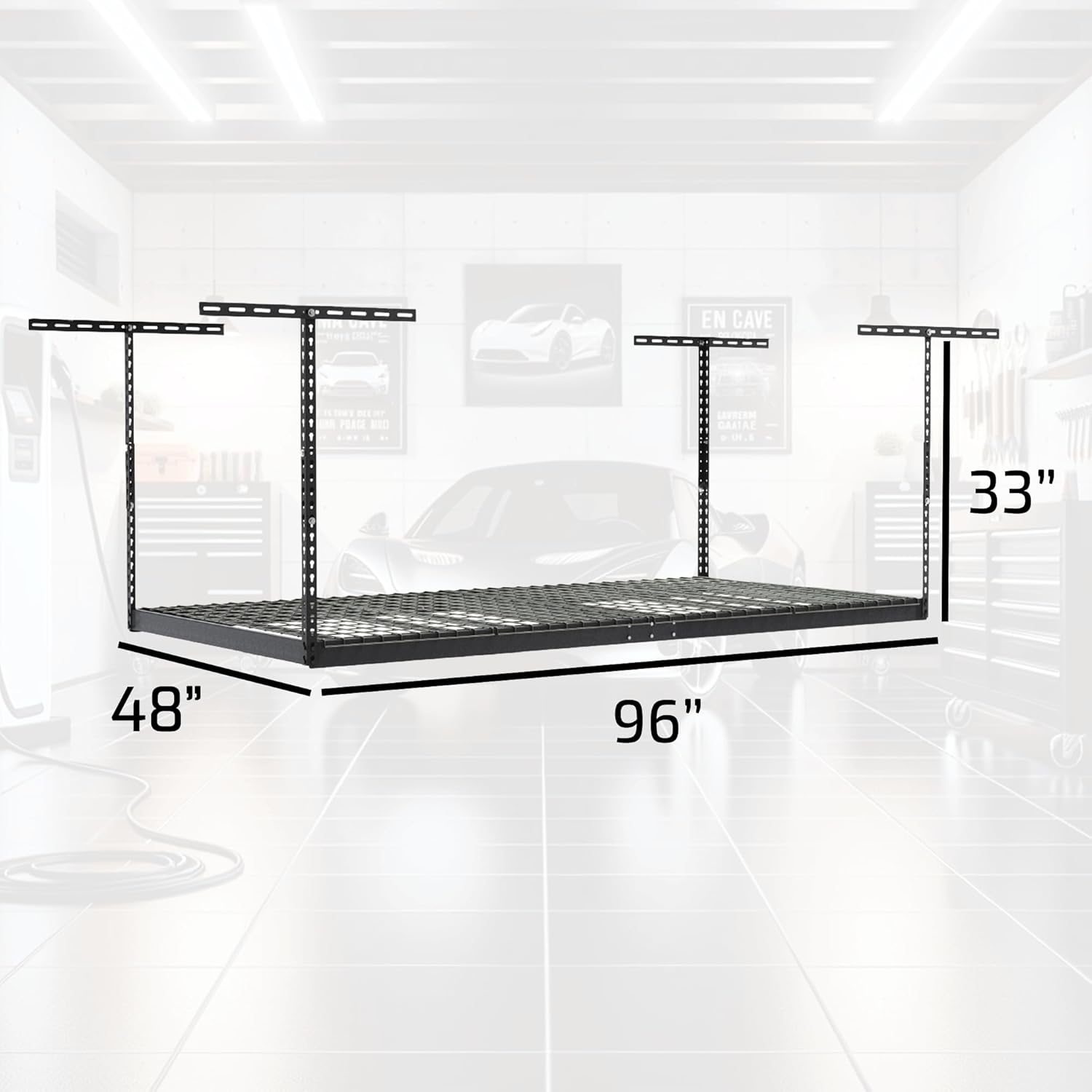 - ADJUSTABLE HEIGHT: Convert the your room from a functionless to functional space no matter the size. Our ceiling organizer has an adjustable drop down letting you customize the distance between the shelf and ceiling from 18" to 33". This 4ft by 8 ft ceiling-mounted rack adds up to 64 cubic feet of storage.