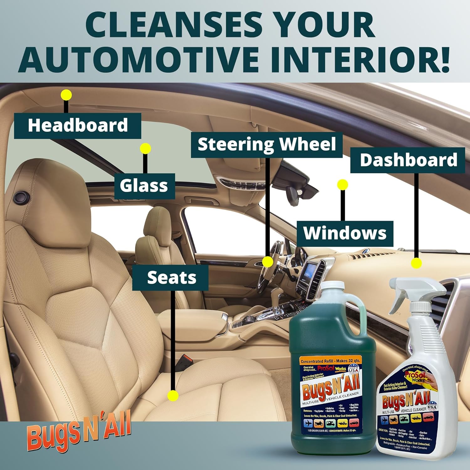 Bugs N’ All Multipurpose Car Cleaner & Degreaser - Bug & Tar Remover Concentrate 1 Gallon - Exterior Cleaner Safe for Car Paint, Metal, Chrome, Aluminum, Windows & Mirrors - w/Free 32 oz Spray Bottle
