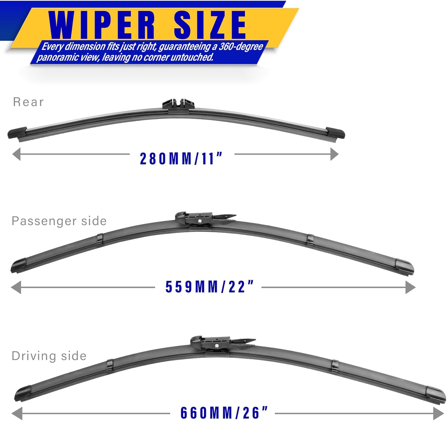 - ăWORRY-FREE SHOPPINGă 3Pcs wiper blades 26"+22"+11" and Instruction Manual. One Year warranty! Refund or return anytime in one year, Long life, smooth engagement.
