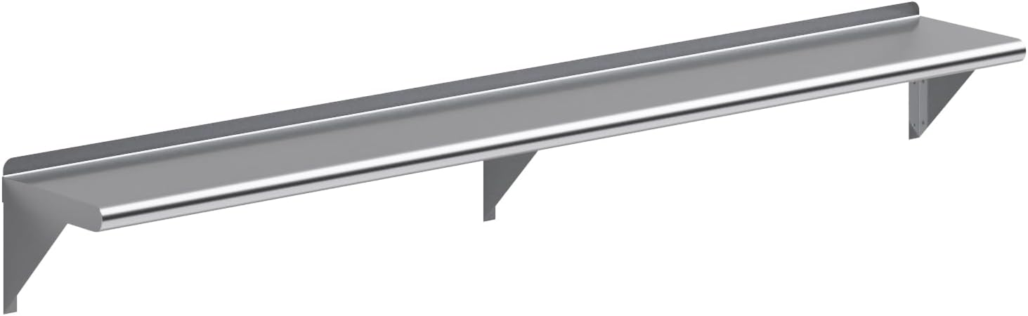 - 10 in. x 72 in. Stainless Steel Wall Shelf with 8 in. High Mounting Brackets. This heavy-duty multifunctional stainless wall shelf is made with 18 gauge stainless steel and can hold up to 230 Lbs of weight. The design features a 1 in. backsplash and bullnose edge. It's made with durable welded corners and support brackets.