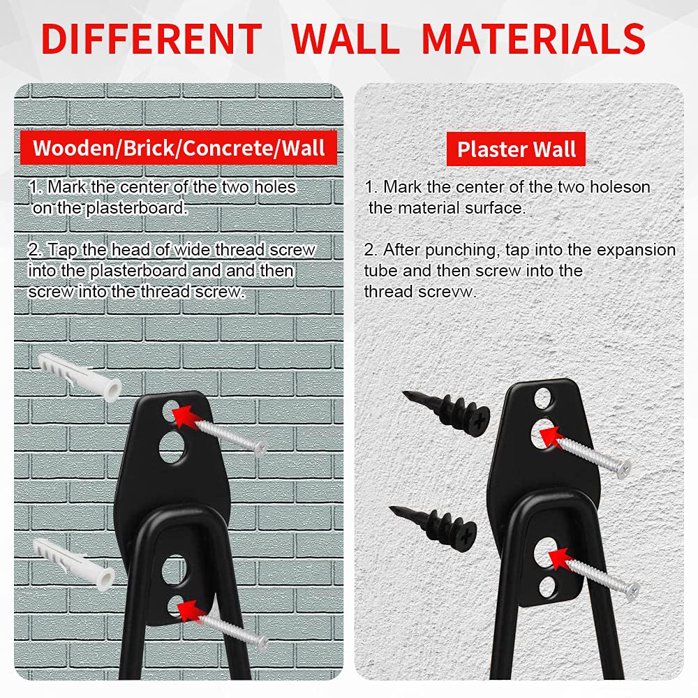 - Easy To Install: These garage hanging hooks are suitable for various walls. You can install them effortlessly. For plaster walls: (1) Insert black expansion screws into the two large holes of the heavy duty garage hooks; (2) Low speed drilling or manual tightening of steel screws. For wooden/brick/concrete walls: (1) Mark the two small holes for the garage hangers on the wall; (2) Drill holes and insert white expansion pipes; (3) Drill in steel screws