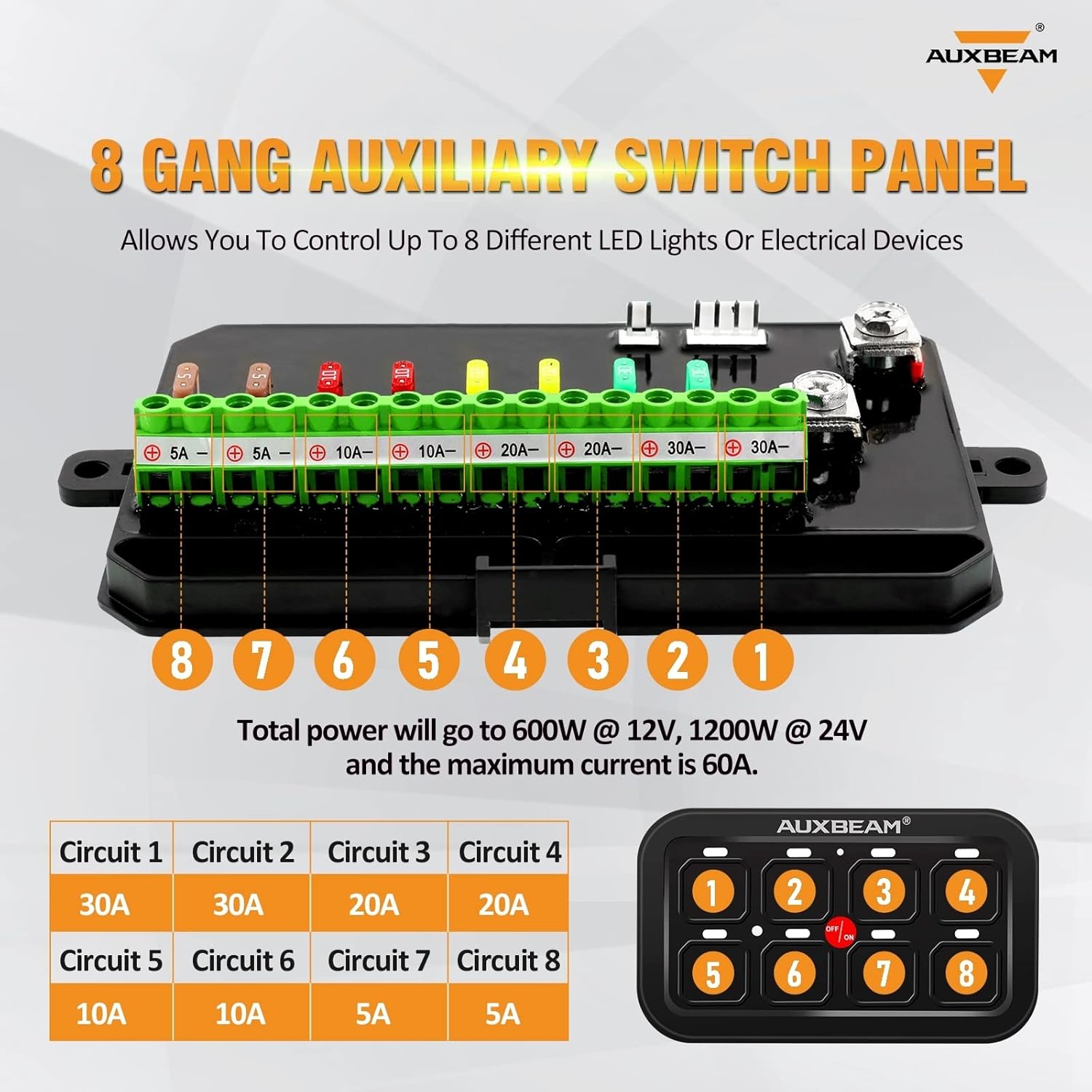 - AUXBEAM 8 GANG SWITCH: Offers a perfect solution to clean up all wiring harness and add a single panel to control everything. This switch pod with 8 circuits can power all types of 12V/24V accessories, Max power rating: 1200W. Max current rating: 60A, Operating temperature: -40β~221β