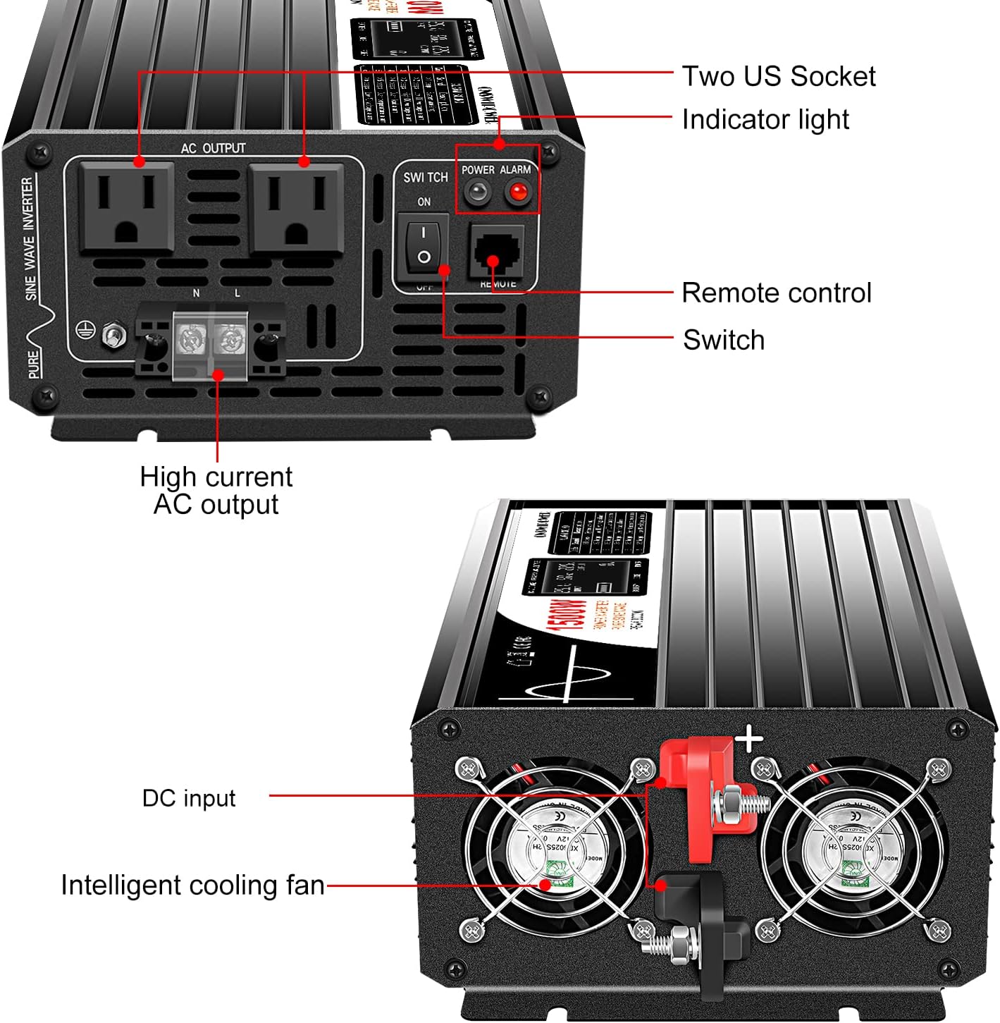 - 【Multi-Protection & Dual Cooling Fans】1) All around protections protects perfectly for your device from low/over-voltage, overheating, overload, reverse polarity, short circuit, low/overcharge. 2) The two cooling fans will start automatically when the temperature exceeds 50°C and the load is more than halfway to prevent the inverter from overheating and causing damage.