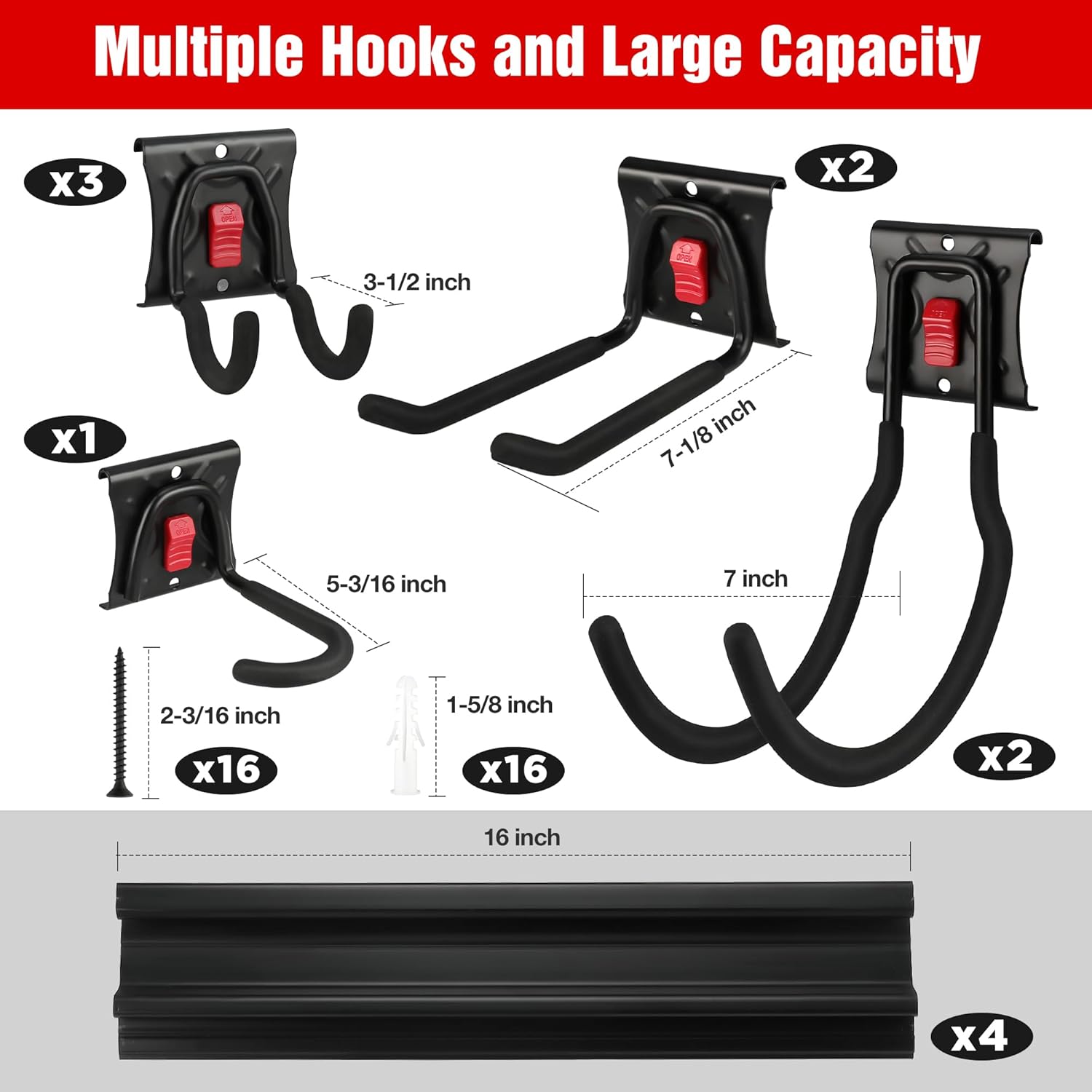• Package Includes: 4 pcs 16inch tool storage rack, 8 pcs storage hooks in 4 size, assorted anchors and fasteners for fast installation