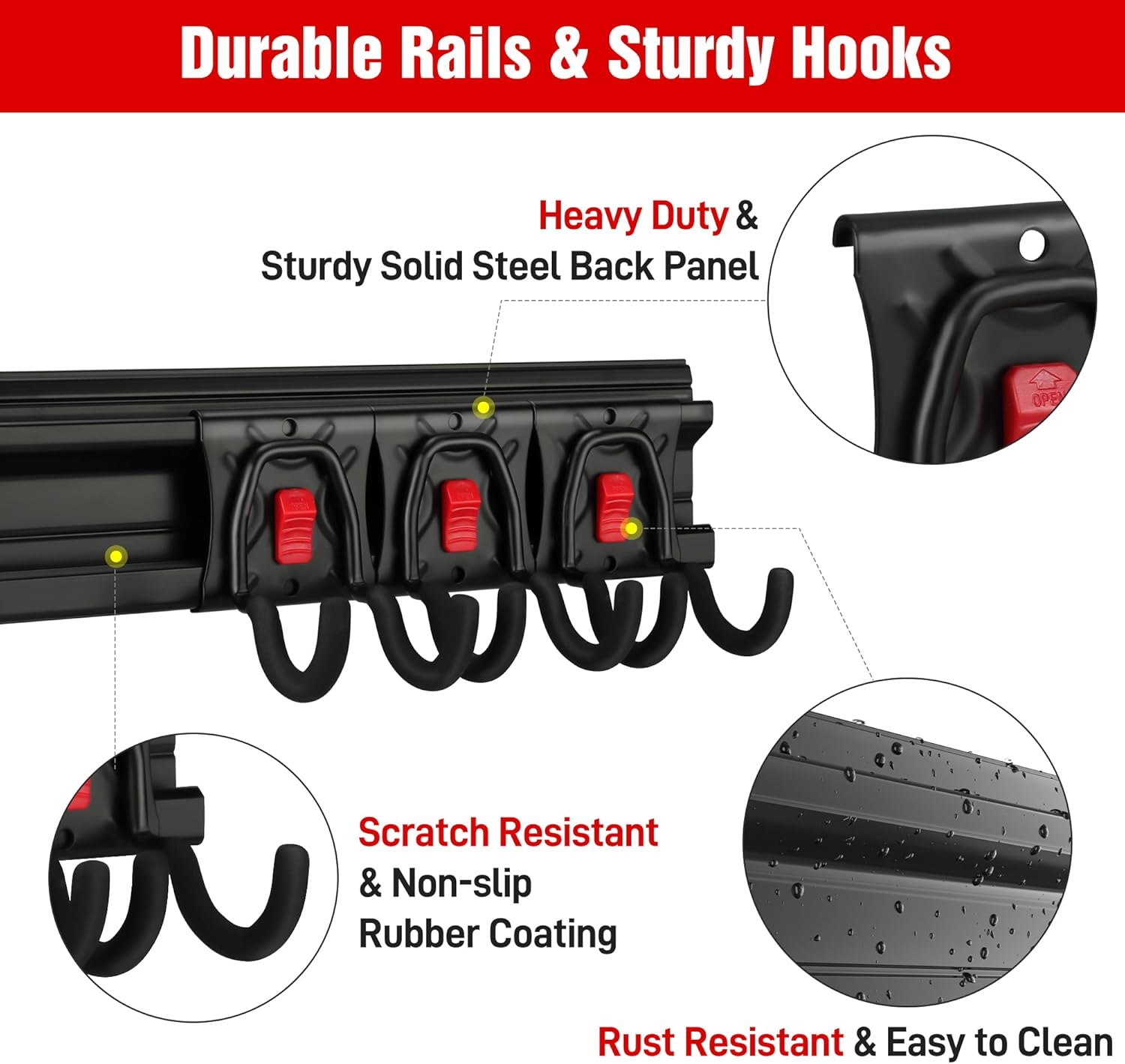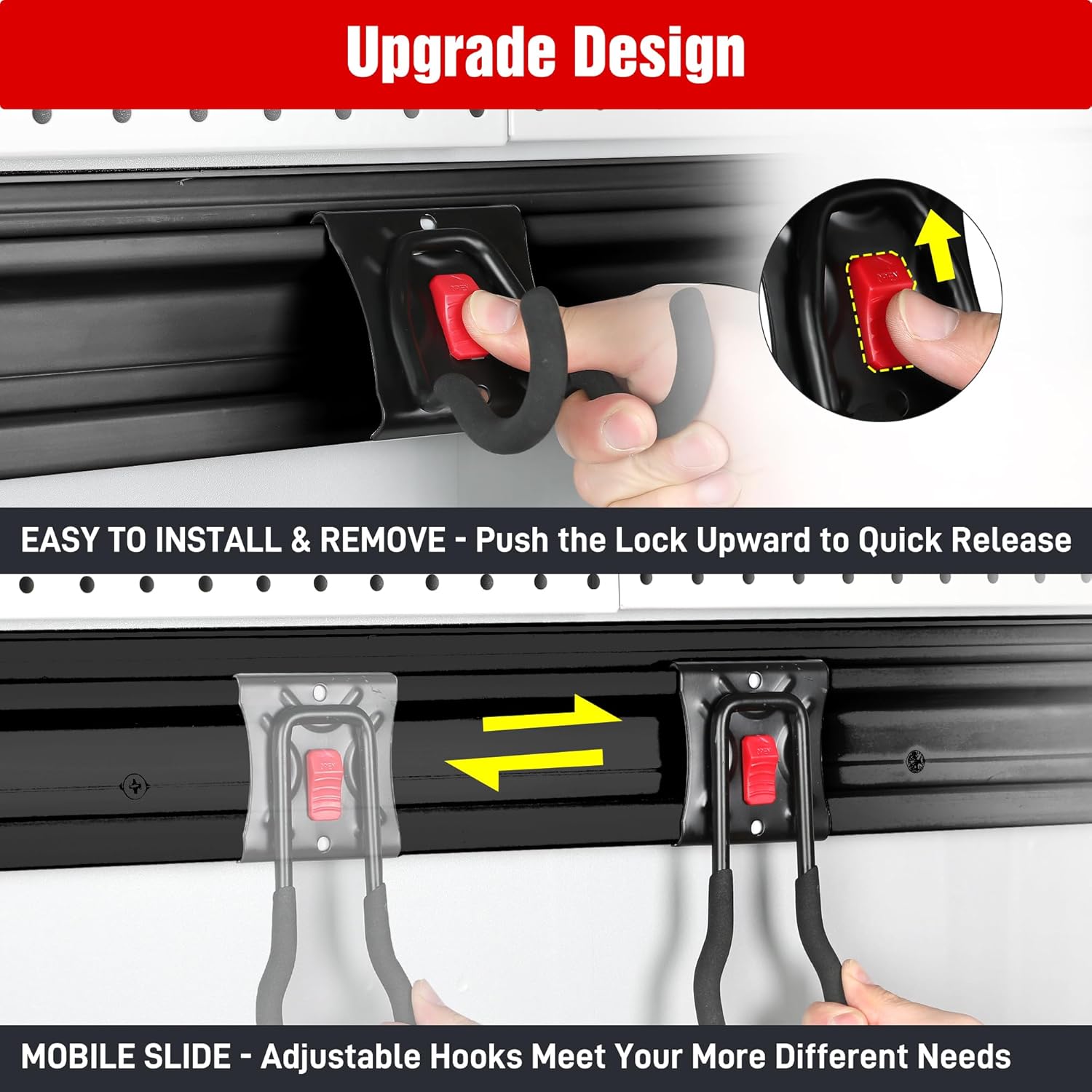 • Adjustable Storage Hooks: The hooks can snap on the rail easily and move around on it to meet your different needs. Upgrade lock design can lock the hook on rail more firmly and easy to release