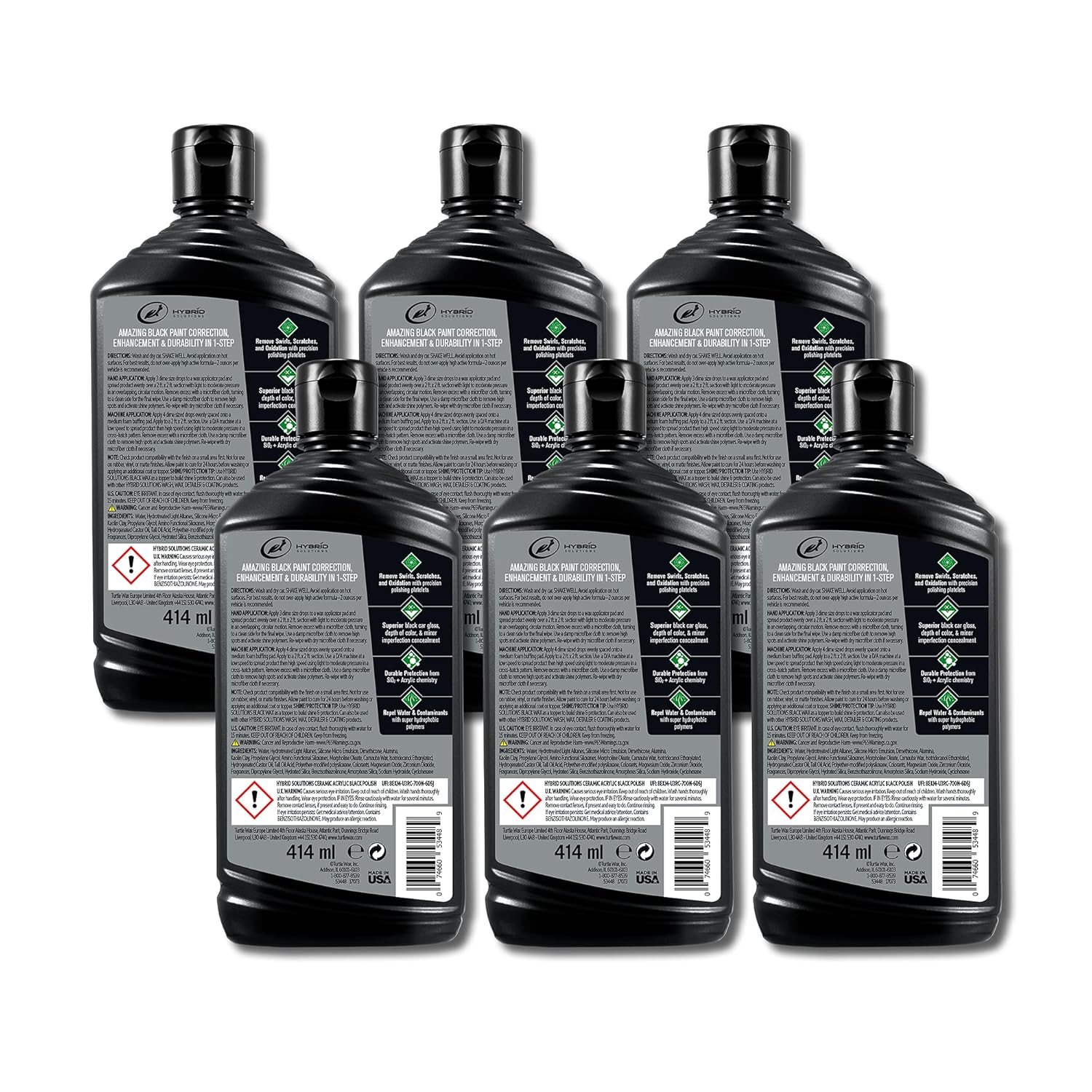 Turtle Wax 53448-6PK Hybrid Solutions Ceramic Acrylic Black Polish and Wax Formulated for Black Car Paint, Removes Surface Scratches and Swirl Marks, Provides Water Repellency, 14 oz. (Pack of 6)