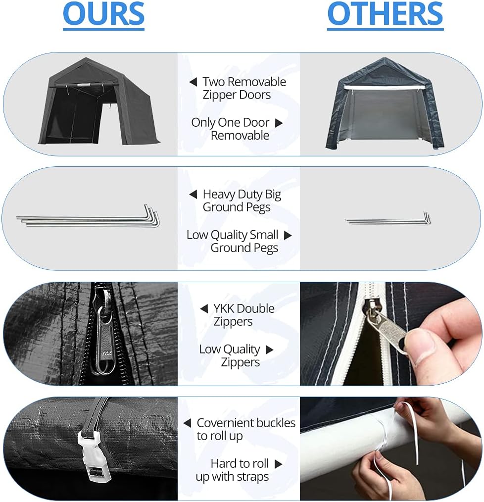 - 【Heavy Duty Durable Frame】✔1-1/2-inch diameter steel poles provide stability and strength to make the storage shelter carport safer. The garage storage tent is equipped with upgraded 0.32X11.81 inch (8X300mm) L-Type pegs, thickened and enlarged to increase stability.