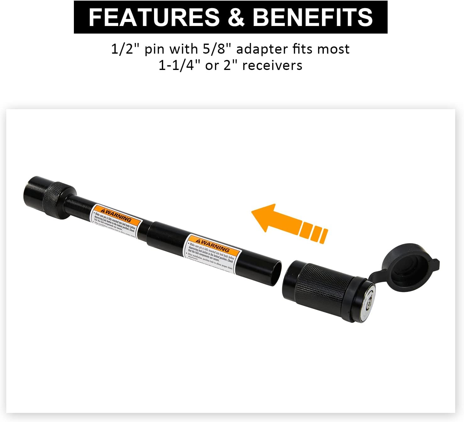 - 【COMPATIBLE WITH MOST HITCHES】5/8-inch and 1/2-inch diameter trailer hitch lock is compatible with 3/4-inch adaptor, fits all class I, II, III, IV, V receivers for trailer, truck, car, and boat.