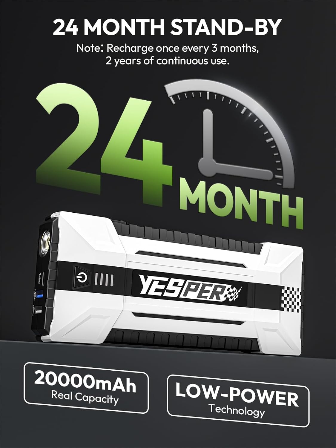- Powerful Emergency Jump Starter -- YESPER YJS20 car battery jump starter with a peak current of 3000 amps is perfect for starting 12V vehicles such as cars, trucks, boats and large vehicles (up to 10L gasoline engines and 8L diesel engines); and equipped with a powerful 20000mAh battery, it can achieve 50 quick starts and can work properly even in extreme climate conditions from -4 to 140°F