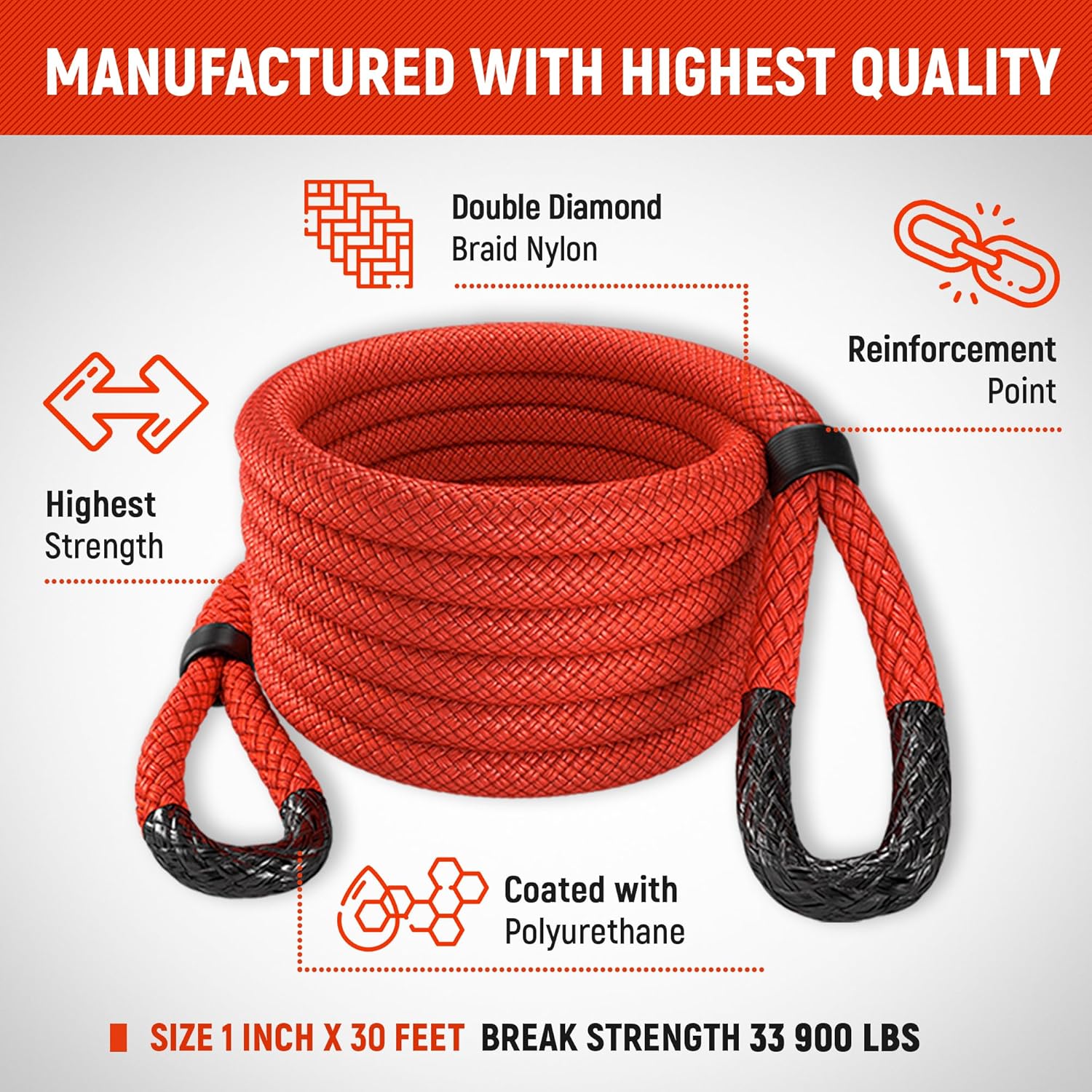 MiolleGear Kinetic Recovery Rope 1" x30' - Heavy Duty Offroad Snatch Strap - Includes 2 Soft Shackle for UTV, ATV, Truck, Car, Jeep, Tractor - Ultimate Recovery Gear