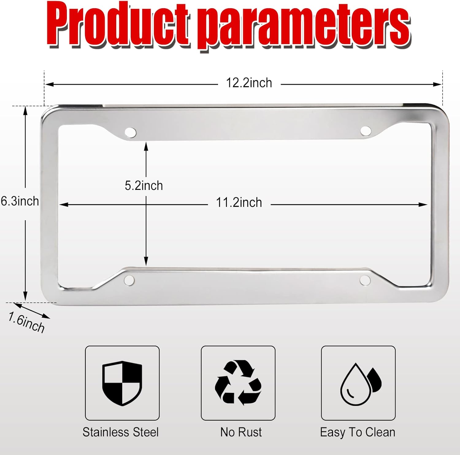- 4 Holes License Plate frame is made of real 304 stainless steel, anti-corrosion, anti-rust, weather resistance,it is one of the highest anti-rust materialss, 1.2mm thick, strong and durable,will not be easily deformed or bent.The surface is mirror polished, uncoated, always keep your car license plate bling