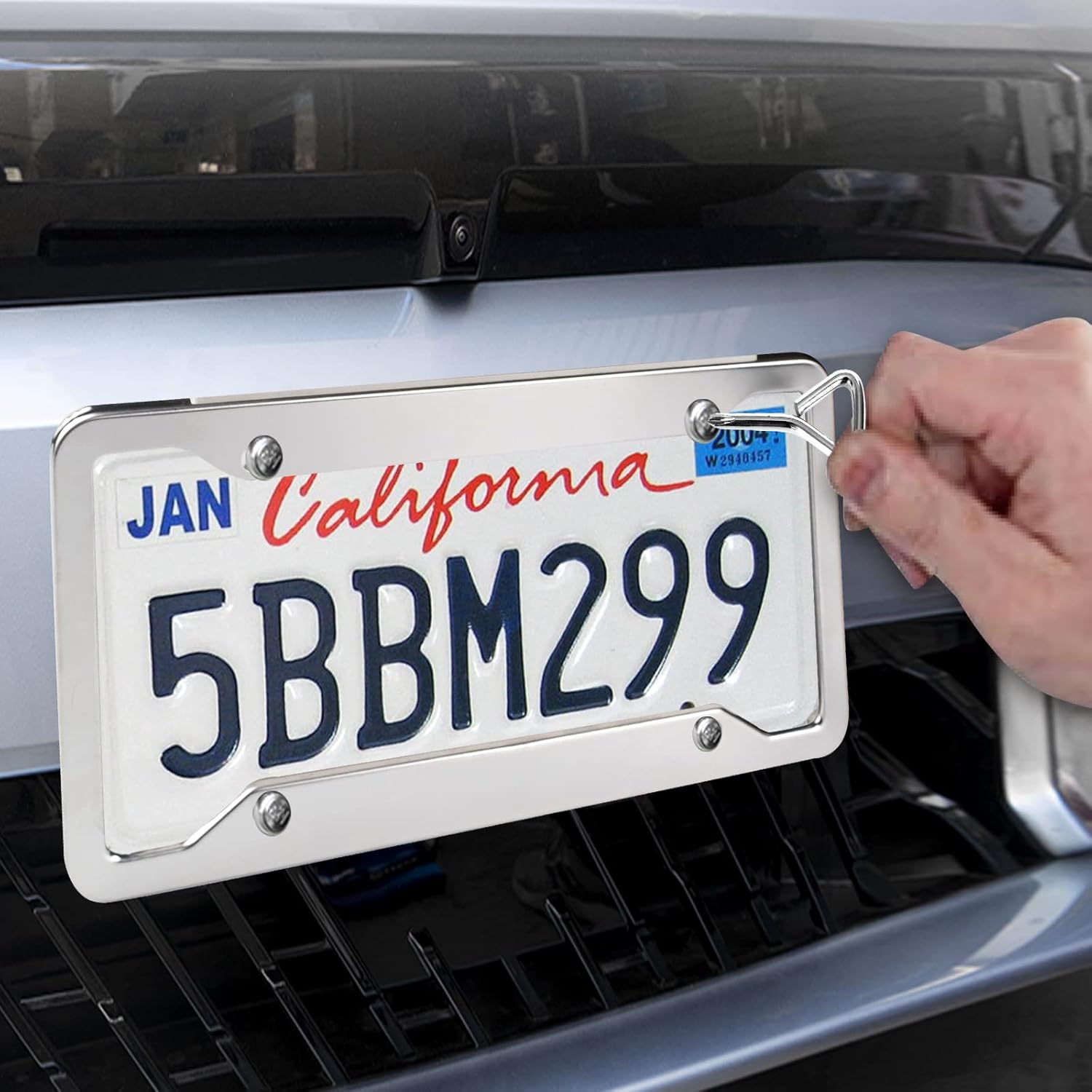 - Package Contents: : 2 pcs License plate frame, 8 screw caps, 4 white nylon Inserts, 8 screws, 8 washers (plastic), 1 screwdriver