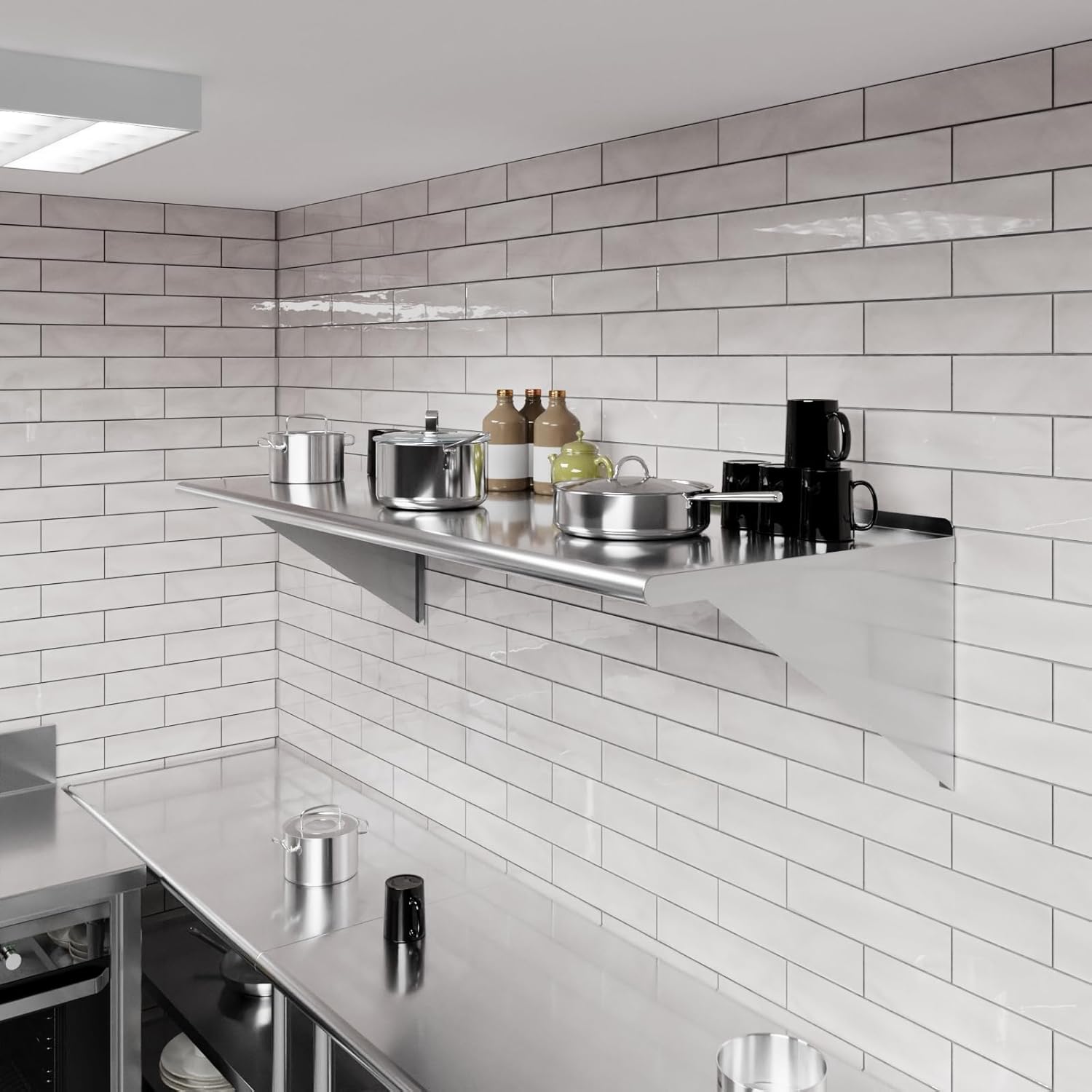 - This corrosion-resistant wall mount shelf can handle anything you throw at it and will last for years to come. Easy to clean and sterilize, metal shelves are superior to wood or glass. Food and liquid won’t get stuck or ruin the integrity of the surface. Easily wipe away excess with no fuss, mess, or contamination.