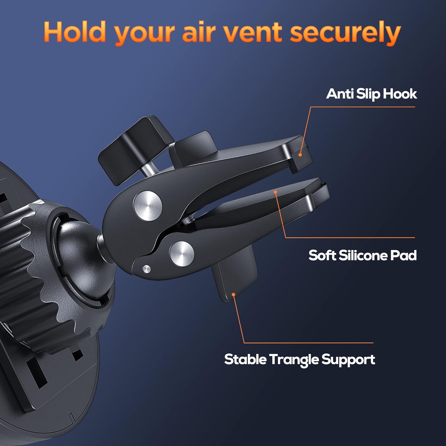 - [Alligator Clip] Our car vent phone mount use the latest improved vent clip won't Slip & Drop, this car phone holder could hold your phone firmly even on the bumpiest road or sharper turn. The clip and the rubber hook will catch one of the car air vent blades tightly. This phone holder for car is made from the most advanced durable sturdy grade materials, making it more resistant to abrasion and corrosion.