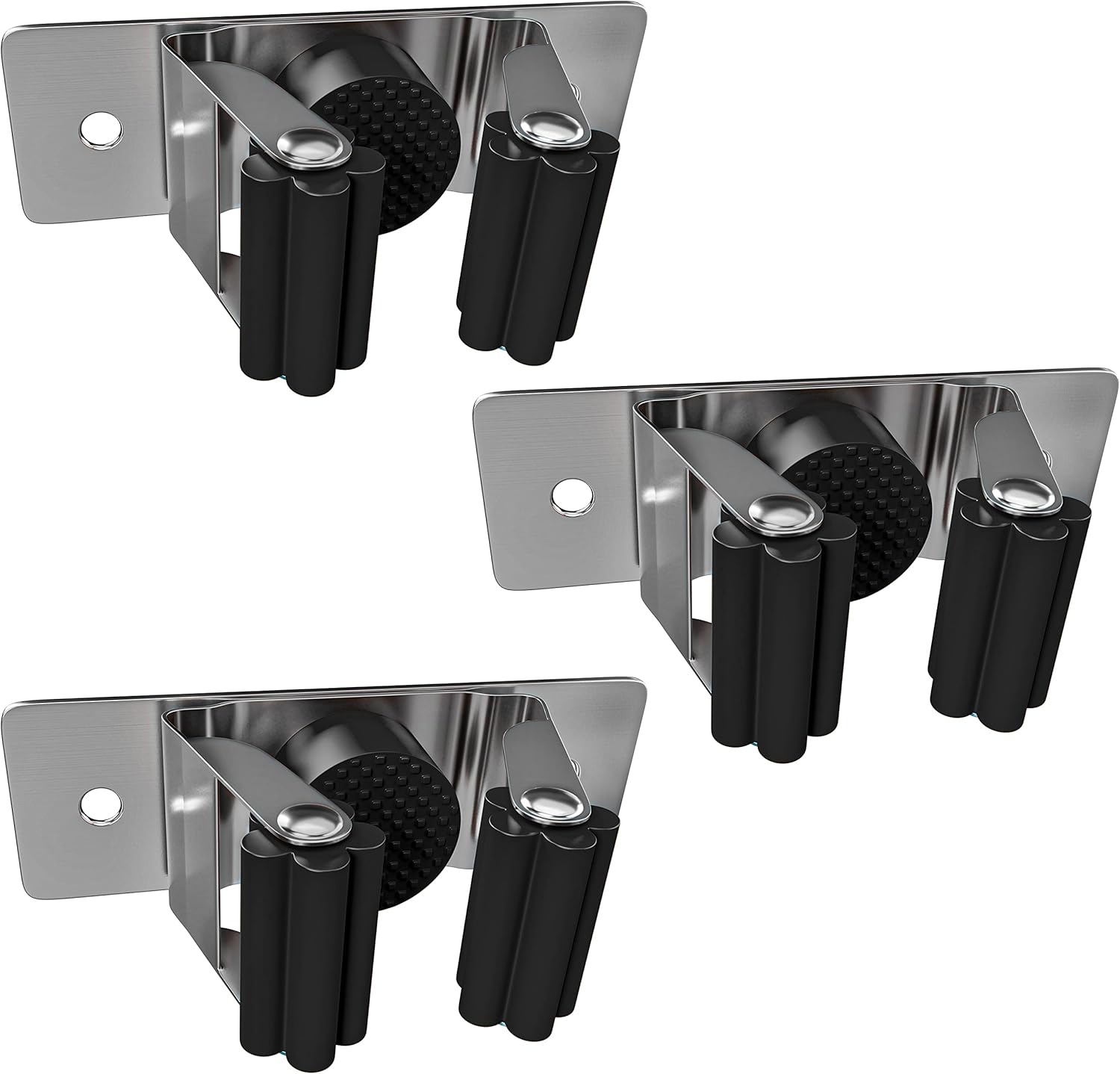 Self Adhesive Broom and Mop Holder Wall Mounted – SUS304 Stainless Steel 2-Slot Organizer with Anti-Slip Rubber Grips, 25lb Load, Adjustable for 0.6–1.4" Handles, Garage Kitchen Bathroom Use, 3 Pcs