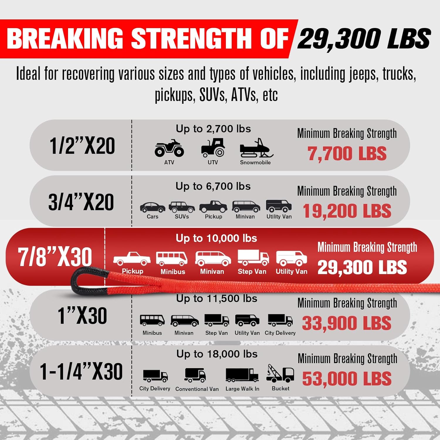 - Superior Toughness: This recovery rope boasts a hefty 29300lbs minimum breaking strength to easily handle your most demanding 4x4 recovery needs. And the double braid nylon tow rope is stronger yet lighter than tow chain of equal strength, which makes the recovery rope ideal for off-road emergency to safely recover and tow your stuck ATV, UTV, snowmobile or SUV out of mud, sand, snow or ditch