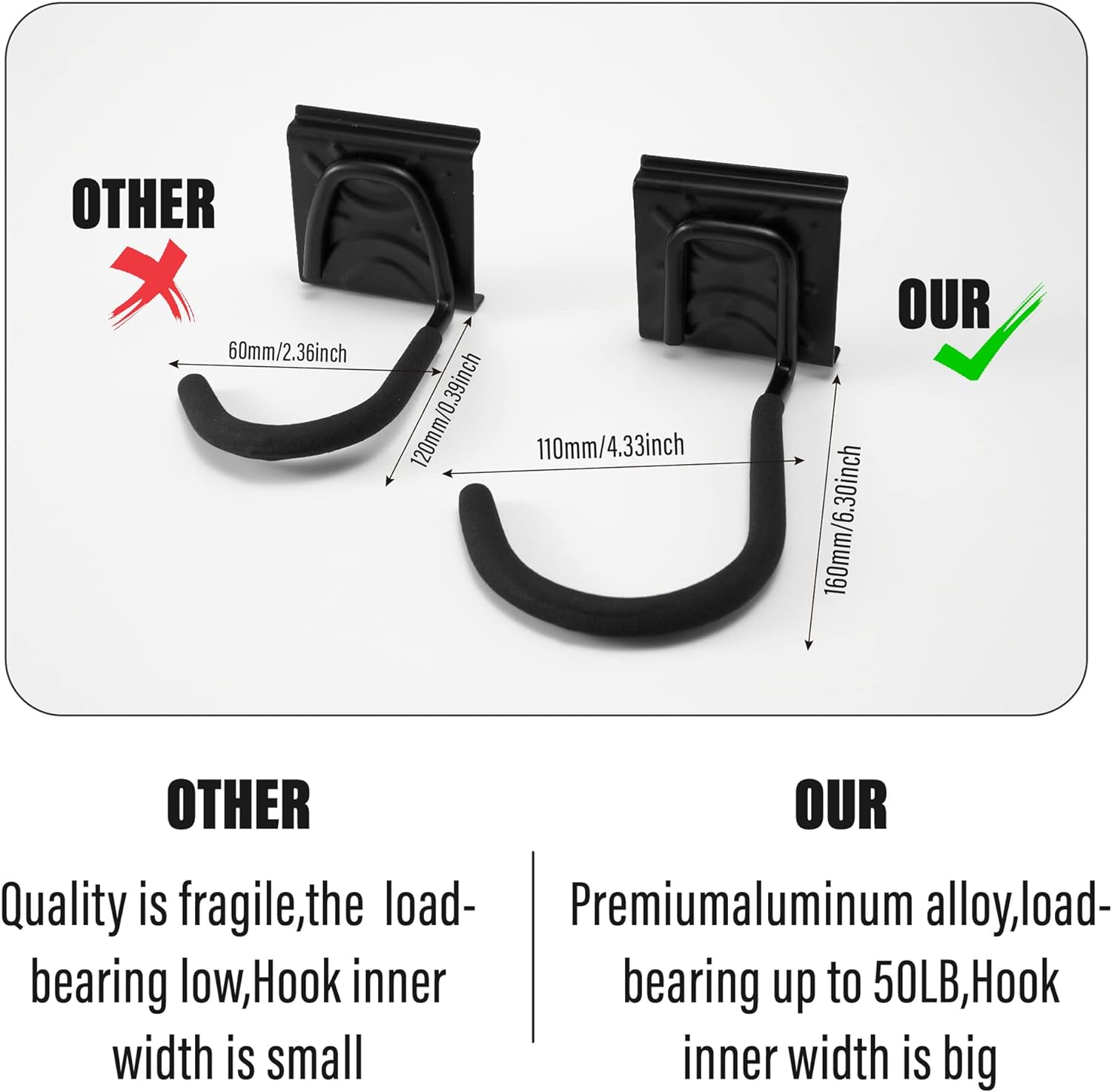 - Upgraded large hook, size 75*160*110mm, wide and strong rubber-coated wall hook, suitable for most types of bicycles: mountain bikes, road bikes, folding bikes, adult bikes and children's bikes, etc. (not suitable for fat tires over 4 inches)