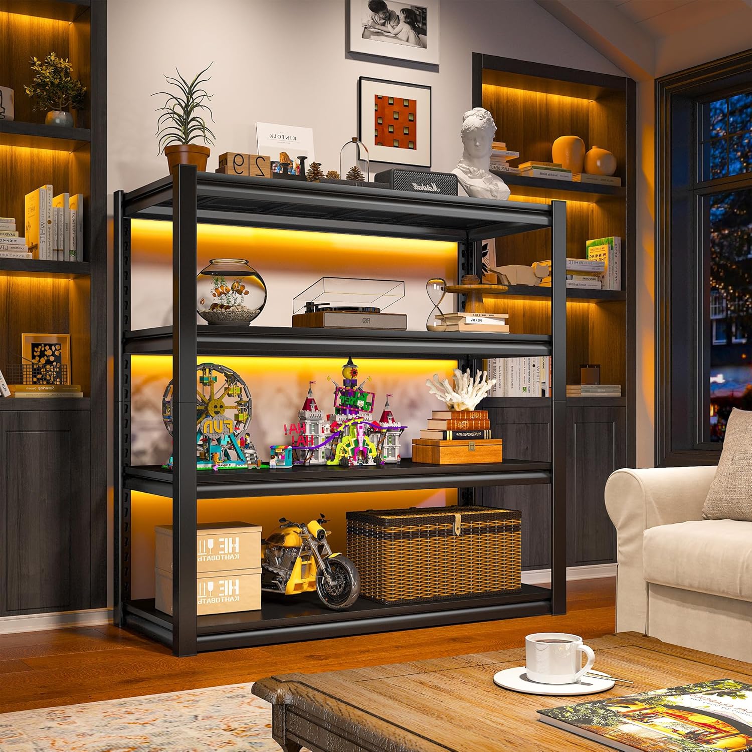 - ăGarage Shelves with Post-Capsă16 post-caps ( 8 extra for separating into 2-modules to use) are included for your floor from being scratched. The heavy duty shelves for storage can be placed in many places. Such as garage, kitchen, warehouse, living room, bedroom, basement, workplace, and etc
