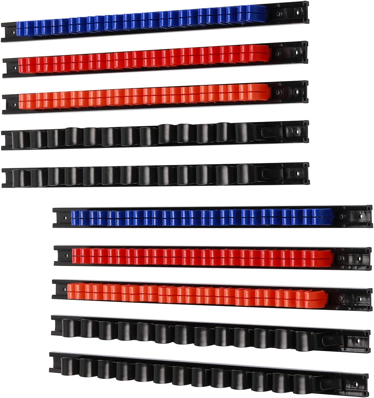 - Set includes 6 pcs screwdriver rails with 13pcs red clips, 13pcs organe clips, 13pcs blue clips and 4 pcs wrench rails with 52pcs black clips