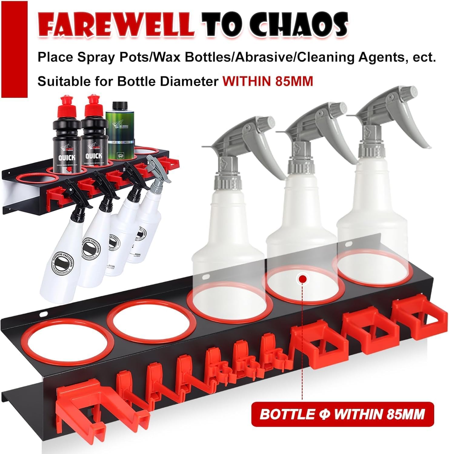 - 【Can Hold Up To 18 Bottles】Spray bottle organizer can holds 32oz bottles with ease. Bottle tool organizers and storage place watering can, Spray Bottle,abrasive, wax jar, etc. Convenient clips for holding all of detailing spray bottles.