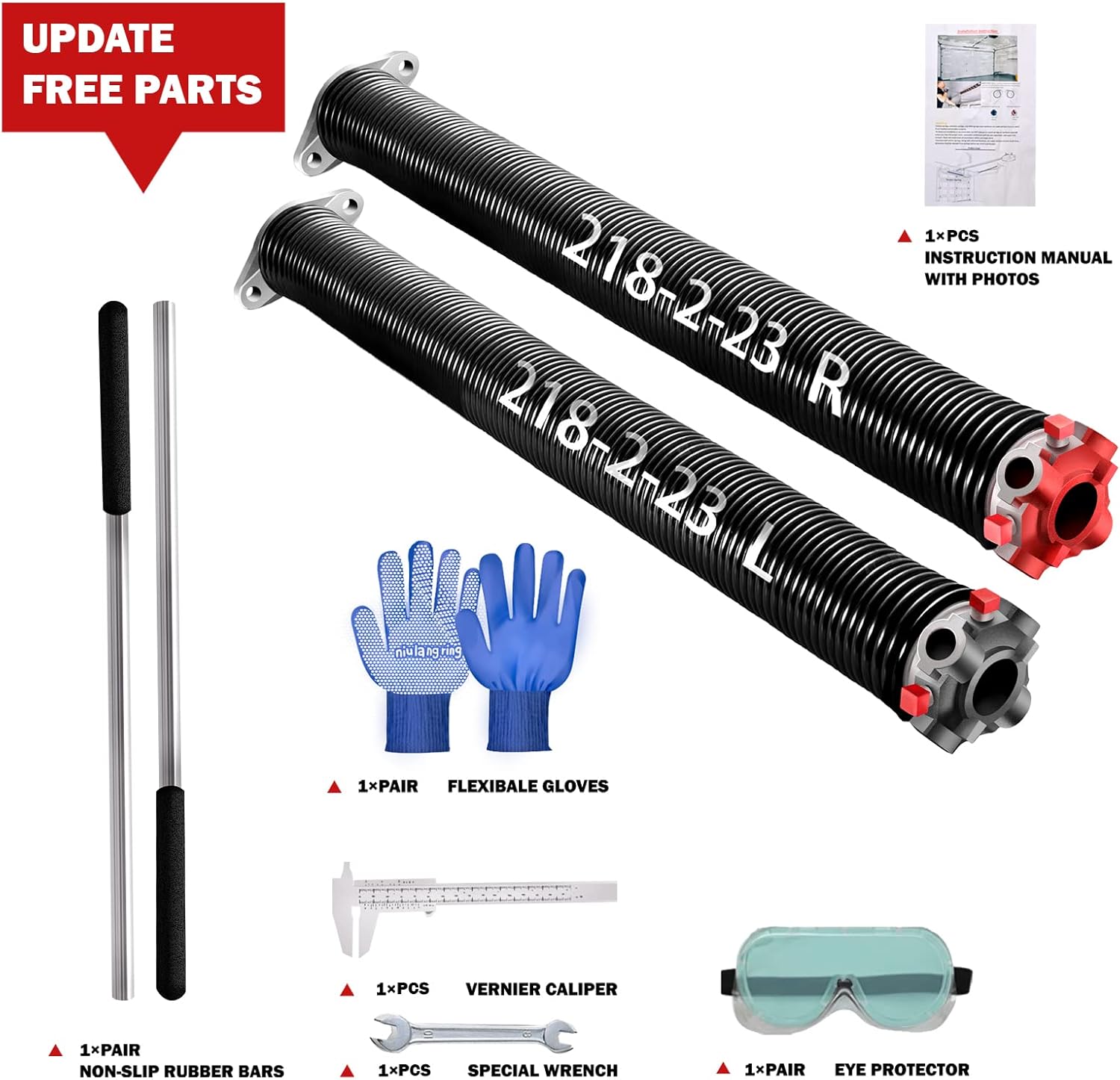 - [EXTRA FREE PARTS ]: A pair of Garage Door Torsion Spring, A pair of 17.2’’ Non-Slip Winding Bars and Gloves/Eye protector/Professional wrench/Mini plastic Vernier Caliper, and Installation Instructions are included in the package, with the professional tools DIY is much easy to learn installing after receiving the product.