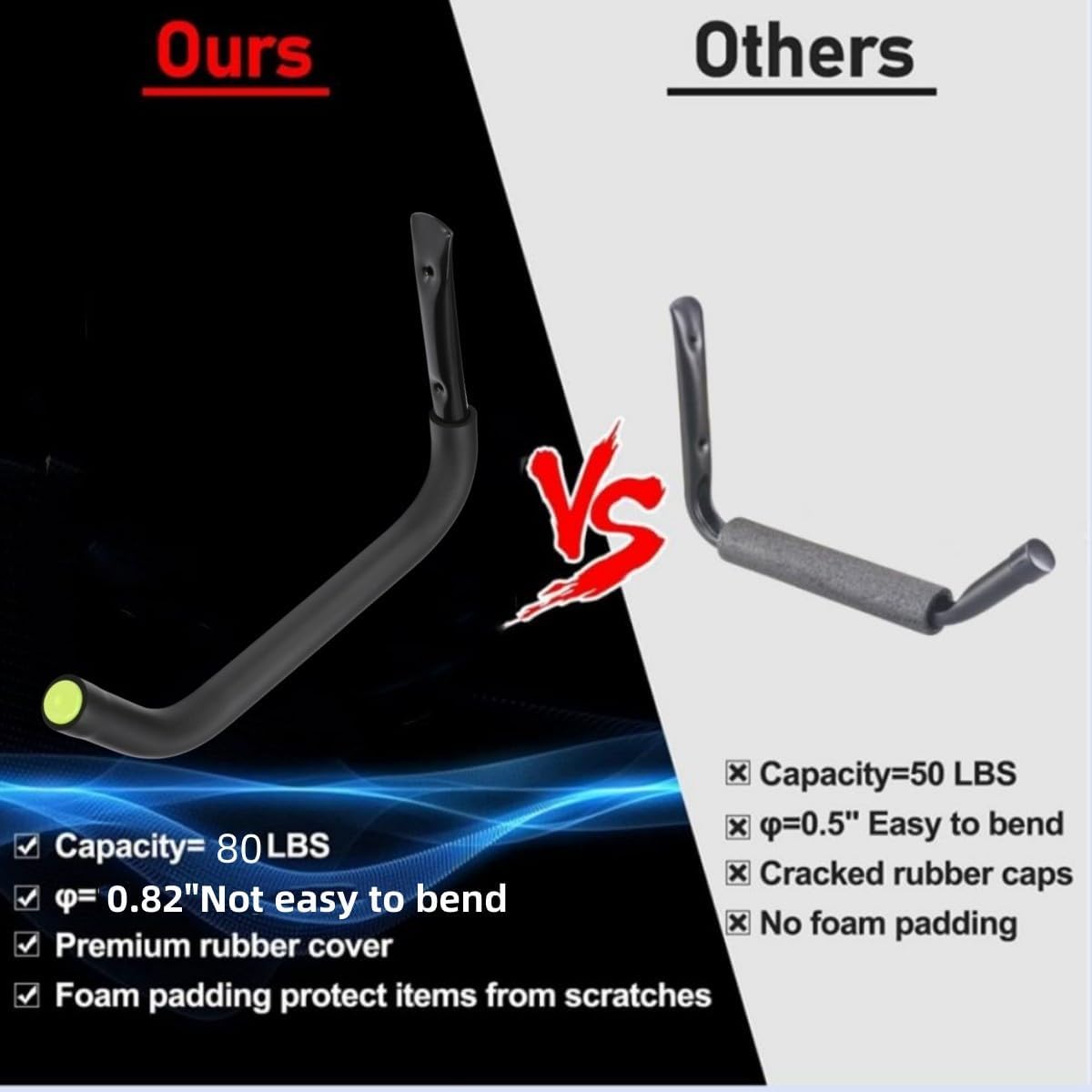 - 【 PACKAGE & BEARING CAPACITY 】4 sets “J” type wall mount garage hooks + 4 pcs nylon storage strap. Kayak storage hook size is 10-1/2 Inch x 15 Inch (38cm x 26.5cm). The diameter of the round tube steel is 3/4 inch (2cm). The maximum load-bearing capacity is 80 pounds.