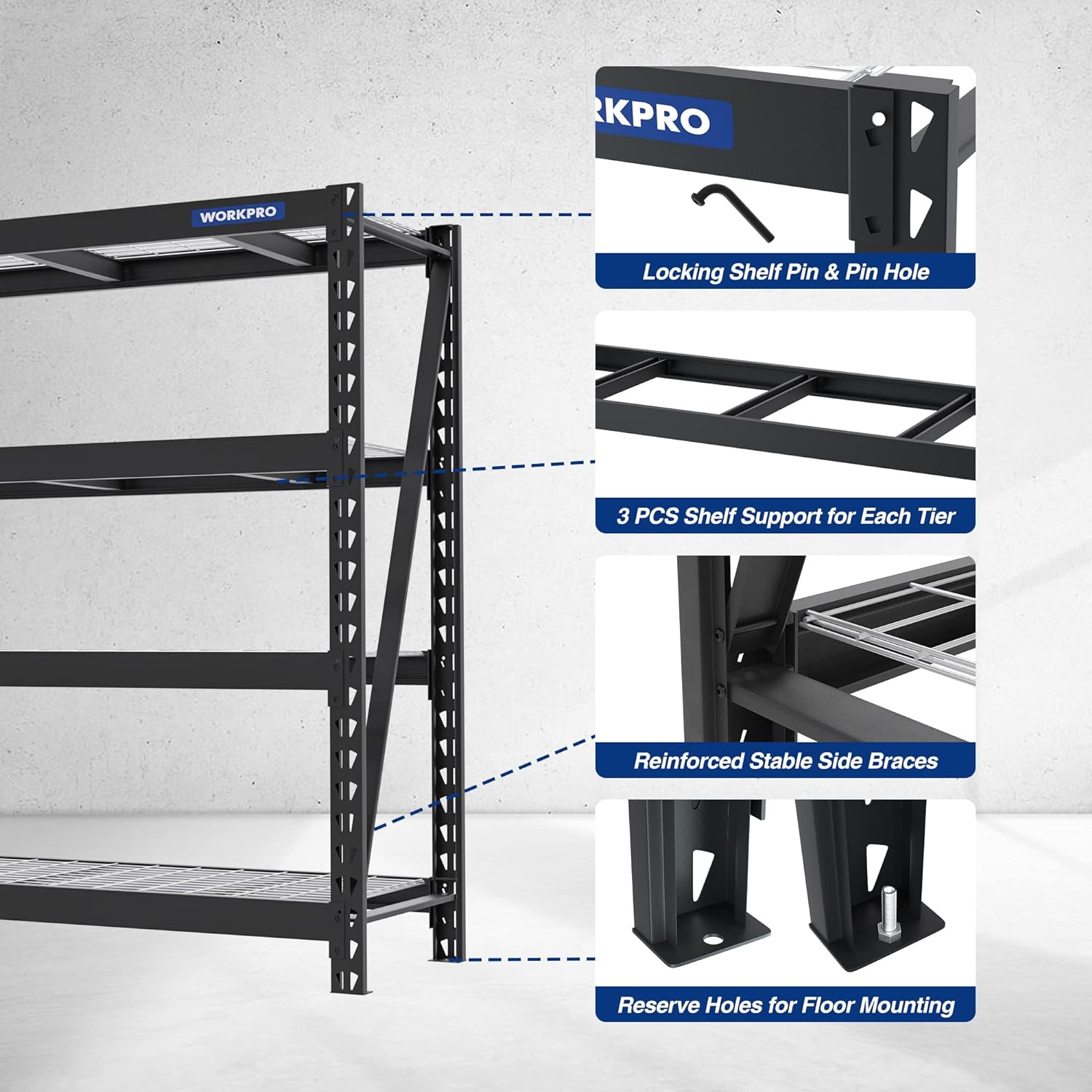 - WHY WORKPRO? — This 4-tier industrial utility shelf features thickened beams, a reinforced closed structure, robust U-shaped steel parts, and locking pins. What we present to you is an enhanced storage system with a floor mounting option and exceptional longevity.
