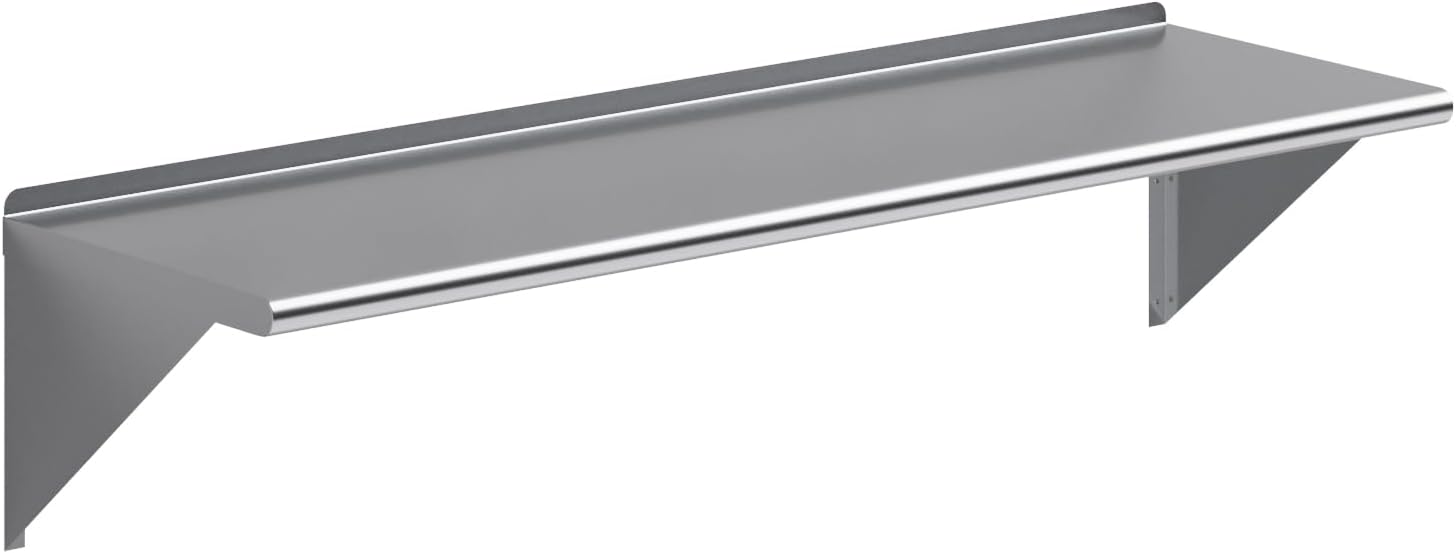 - 18 in. x 60 in. Stainless Steel Wall Shelf with 13 in. High Mounting Brackets. This heavy-duty multifunctional stainless wall shelf is made with 18 gauge stainless steel and can hold up to 450 Lbs of weight. The design features a 1 in. backsplash and bullnose edge. It's made with durable welded corners and support brackets.