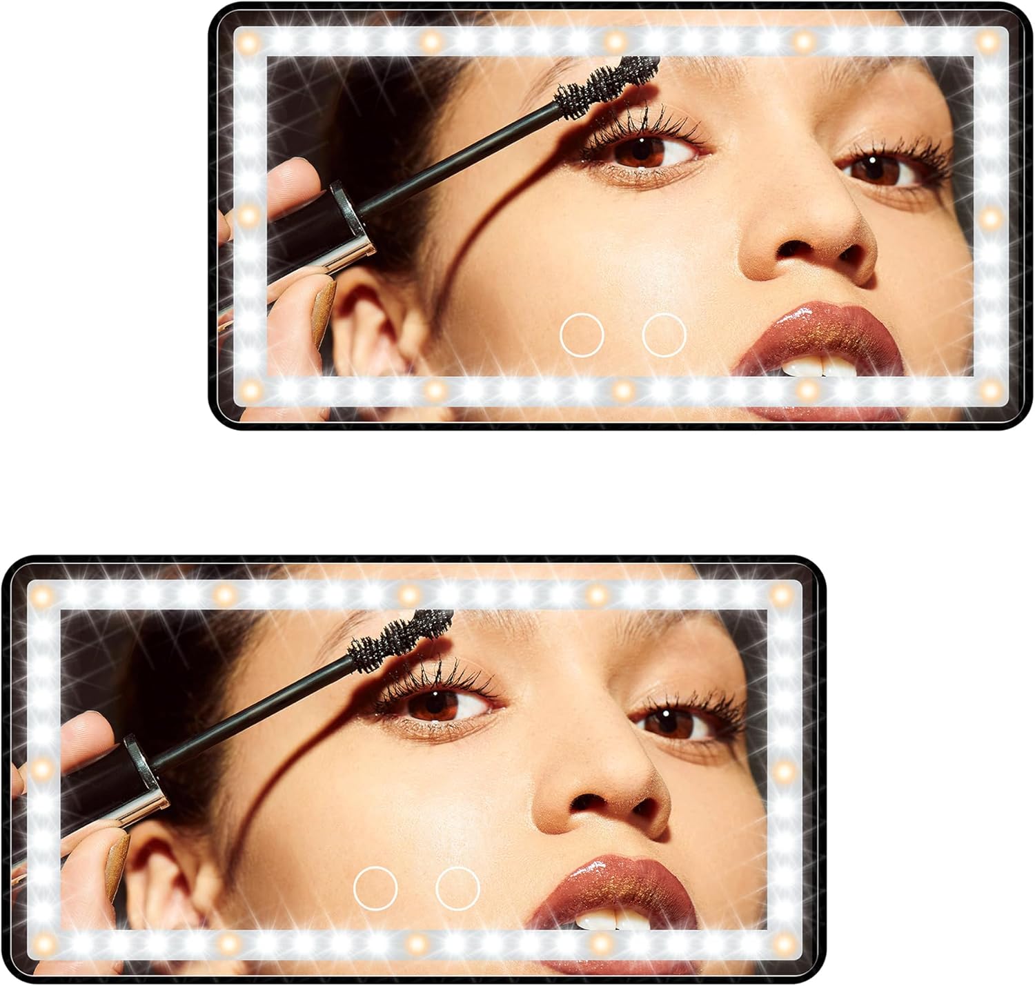 - DIMMABLE BICOLOR LED LIGHTS: The car makeup mirror has 12 yellow lights and 48 white lights, which is 40% brighter and 60% less energy than normal bulbs. Short press the 2 sensor switches to replace 3 light colors: white, yellow, white and yellow. Long press for dimming according to what you need. 2500-6500K color temperature is equivalent to outdoor sunlight, the makeup is naturally no difference
