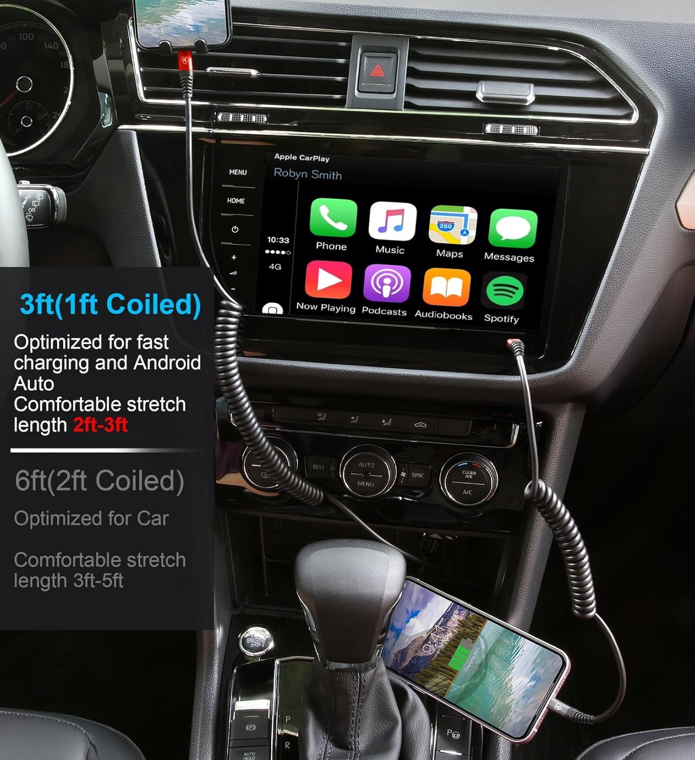 - Elastic Coiled Lightning Cable : Coiled lightning cable 1FT (stretchable to 3FT, comfortable stetch length 1.5ft-2ft) , coiled lightning cable 2FT (stretchable to 6FT, comfortable stetch length 3.5ft-4ft) and bounce back to normal length. You can use it in the front seat of your car and store your iPhone device in a compartment or on the phone holder of the car.