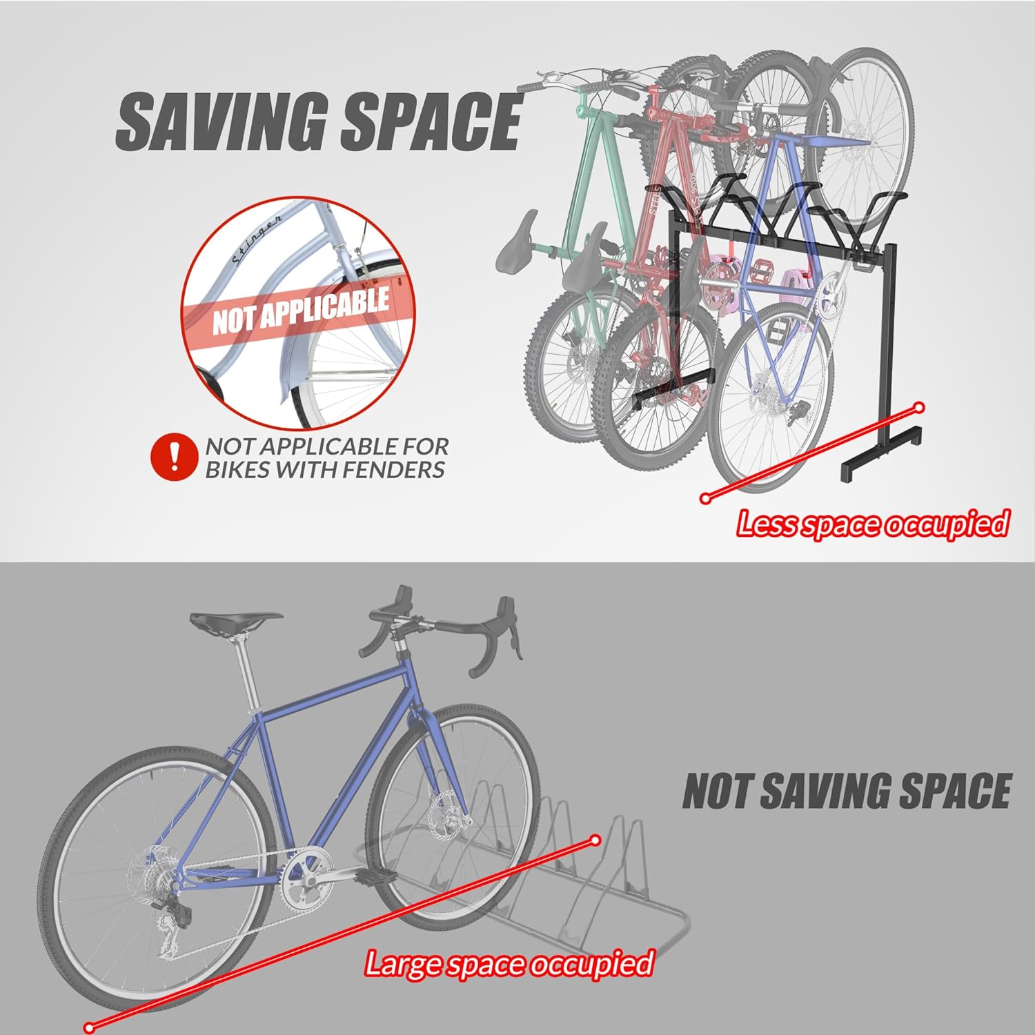 - Multifunctional Freestanding Bike Rack: Our bike floor rack serves as the paramount bike storage solution for various settings – be it your garage, basement, backyard, or even outdoor. With its capacity to comfortably fit 3 bikes, the rack can accommodate adult bikes with tire width up to 2.5". It‘s great for most kinds of bikes, including road bikes, mountain bikes, hybrid bikes and kids bikes. Its versatility and thoughtful engineering make it a reliable choice for bike storage solutions.