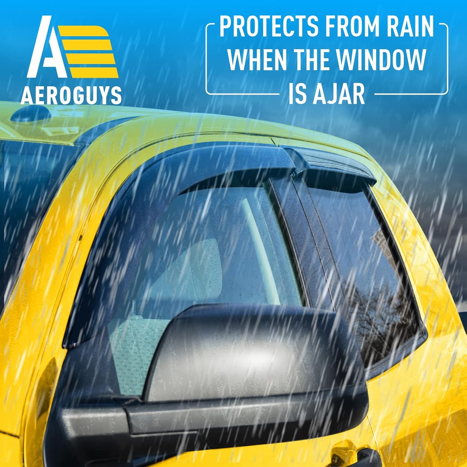 - No Tools Needed, Quick and Easy Assembly β These rain guards are very easy to fit. TAPE-ON INSTALLATION provides perfect fit for your truck. Just slip it onto your carβs window and your job is done within minutes. There is no drilling or no tools required. Be sure that AEROGUYS window deflectors are water resistant, sun protective and will not bend, break or crack regardless of the weather conditions.