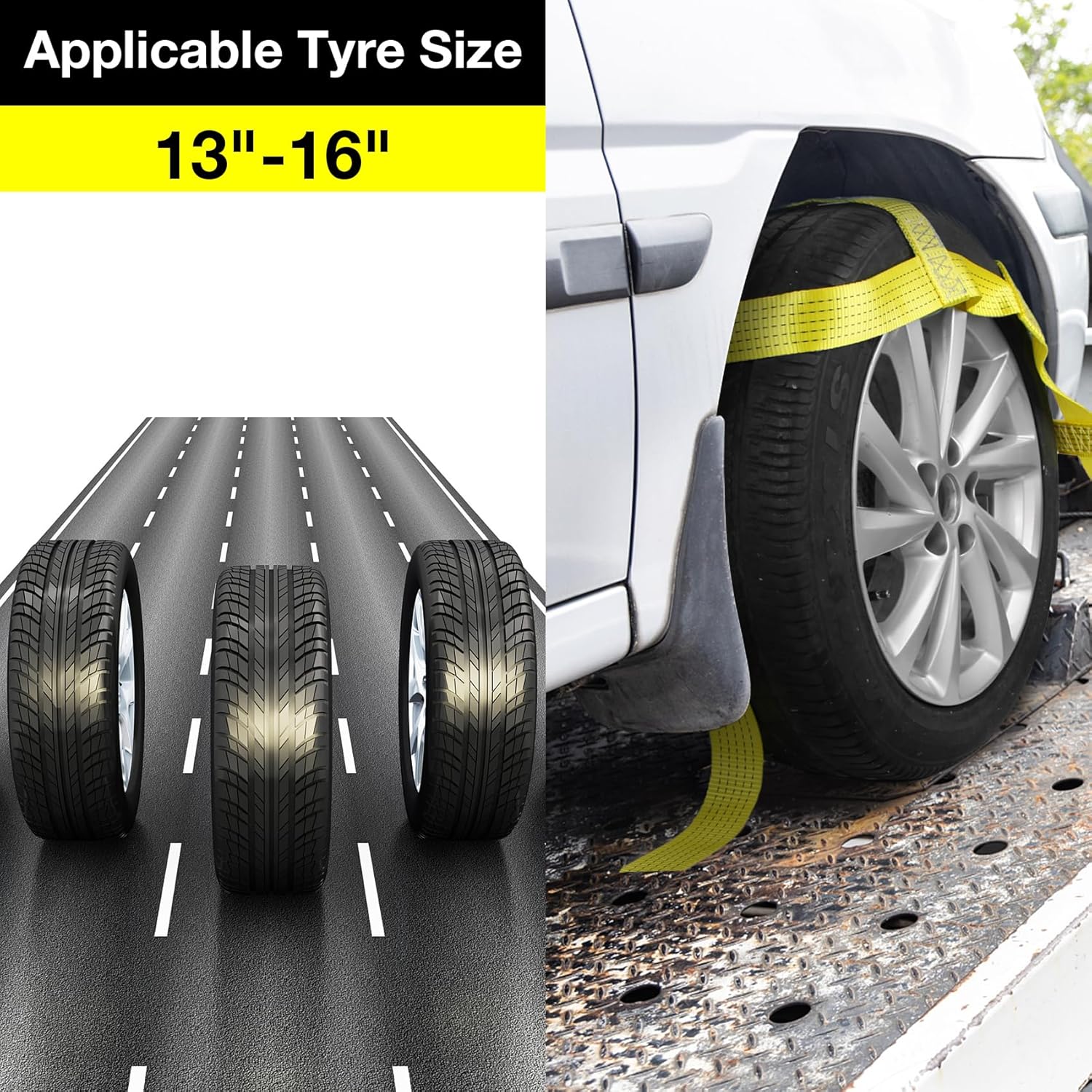 - PROFESSIONAL GRADE TOW DOLLY STRAPS: Car dolly straps set of 2 heavy duty is compatible with most 13"-16" standard wheels, each strap has 2 flat hooks on one end.(2 pack)