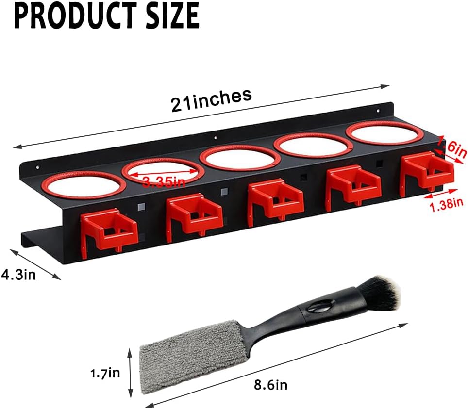 - SIZE: The spray bottle rack size: 4.5 inch*21 inch, Hole diameter is 3.3 inch. Package include: 2 spray bottle rack+ 10 Hooks+ 1 set of detail brush+ 8pcs screws. Large-capacity design to meet all storage needs. You can easily get the watering can, polishing machine, vacuum gun, cleaning gun and other tools you need. It can well organized your tools.