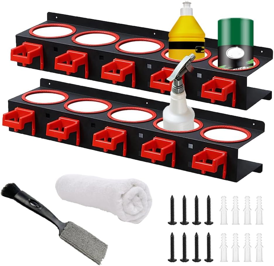 - SPRAY BOTTLE WALL RACK: The 2 pack spray bottle rack storage are equipped with 10 hooks, 1 double-headed detail brush, and 1 clean cotton cloth. It basically covers the storage location of the tools used in the car wash, such as watering cans, cleaning brushes, etc. Our spray bottle rack is also equipped with a set of detail brushes to clean the gaps throughout the car. Suitable for workshops, garages and car accessories shops.