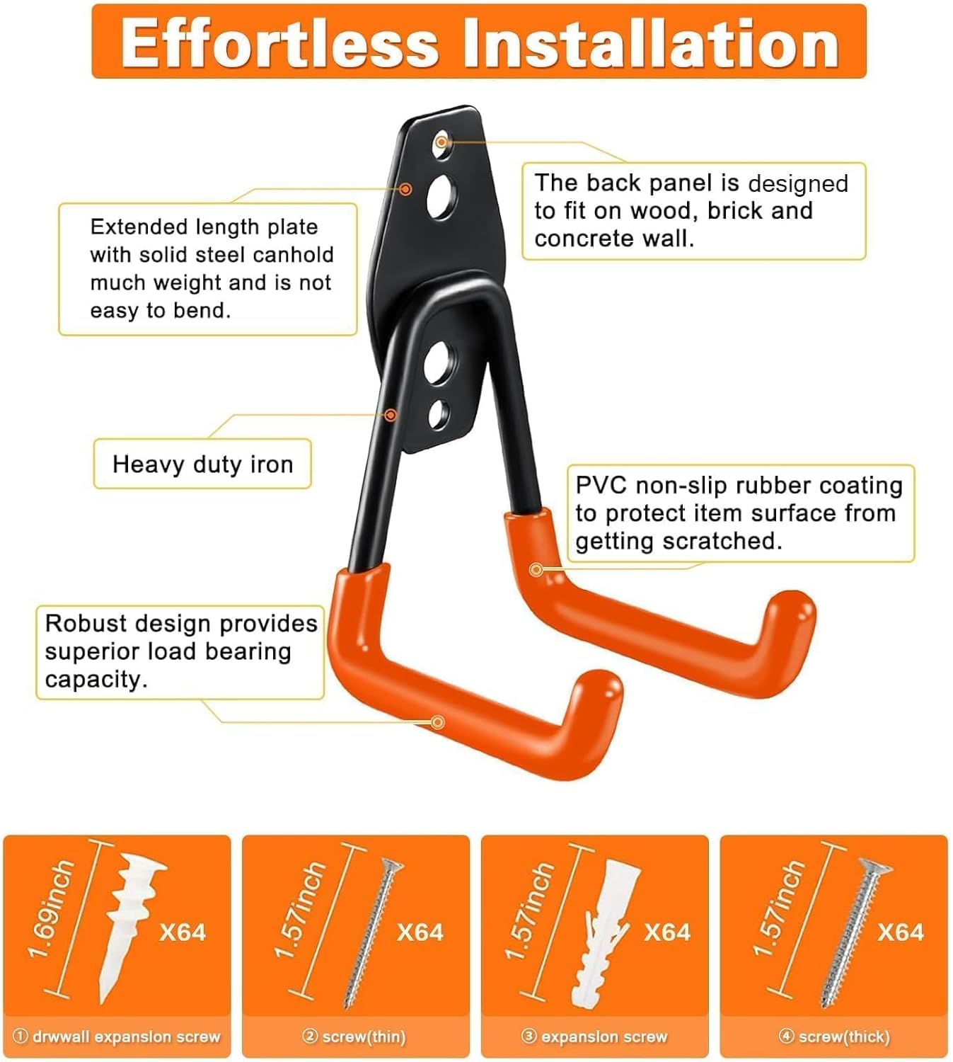 • 【Easy Installation & Easy to Get Started】 Although Jack is not good at professional installation, he found that the installation of GUDEMAY heavy-duty garage hooks are very simple. GUDEMAY store gives away 4 different types of screws, each with 64 pieces.Just use the included screws to fix the hooks to the wall. He quickly completed the installation and began to enjoy the convenience brought by the hooks. This made him more confident to complete the garage organization work, and now his garage has a brand new look.