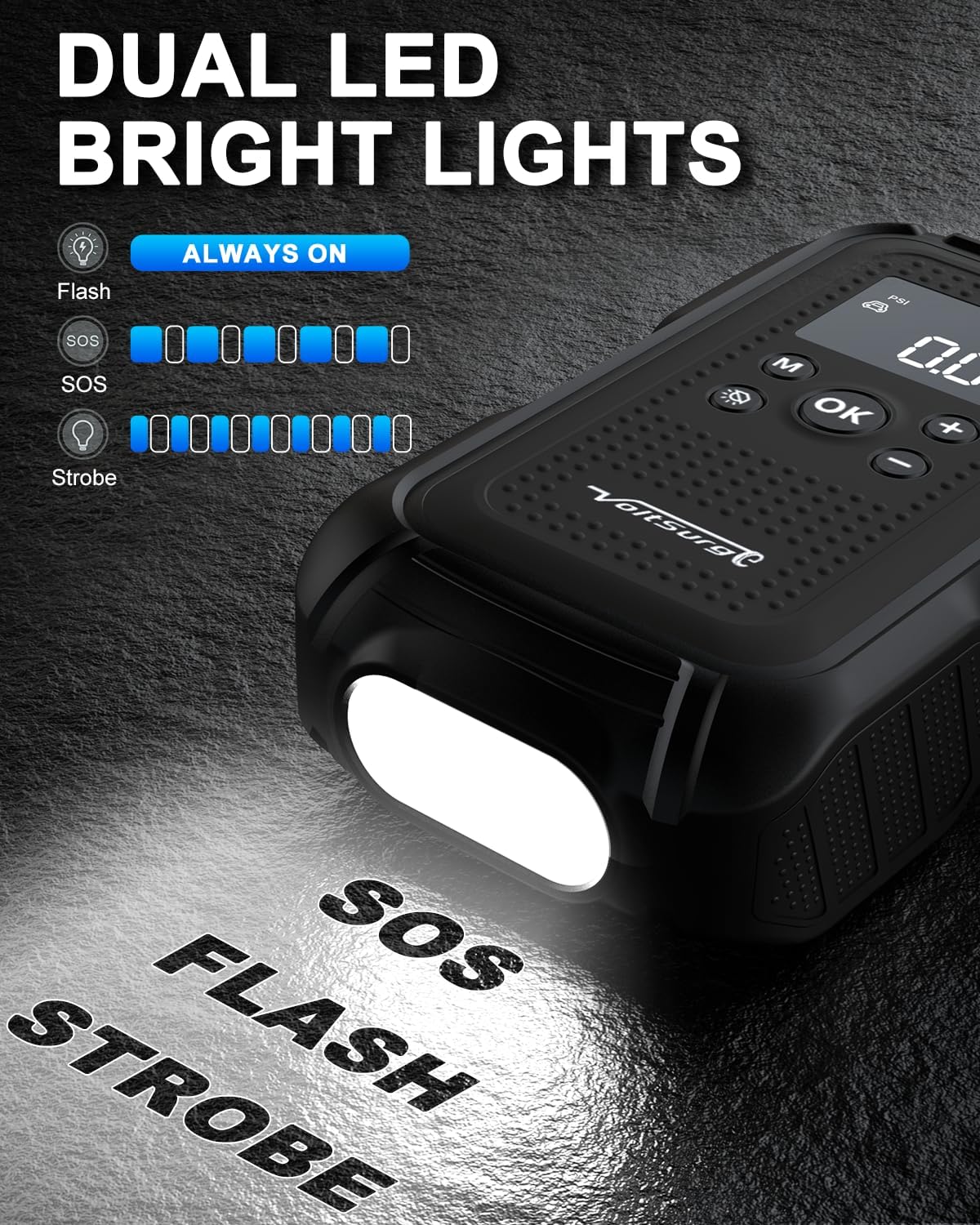 - 【Inflatable Pump With On-Screen Display】 150PSI Portable Cordless Air Tire Pump - Not only is it a portable jump starter booster package, but also an air compressor with preset 4 inflation modes and automatic shut-off to continuously provide fast and proper inflation for car tires, sports balls, and more. It supports intelligent pre-set tire pressure and automatic shutdown function, eliminating the need for repeated adjustments and checks. The LCD display displays the tire pressure and the power of the device in real time