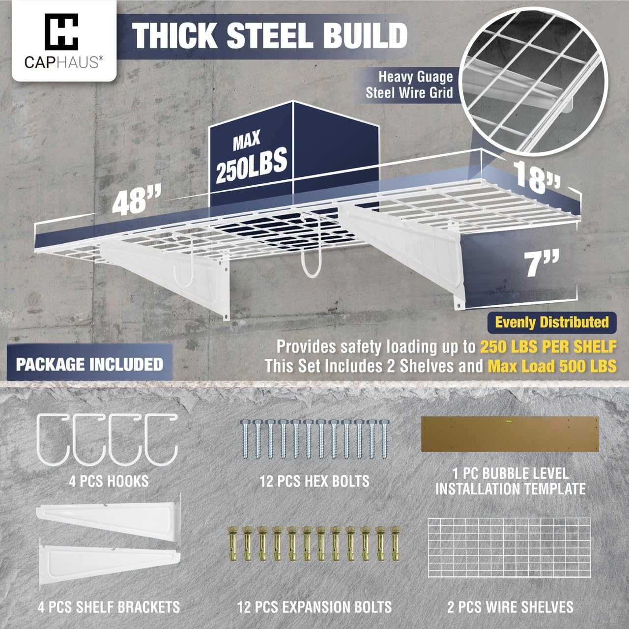 - π¨ Robust Steel Construction - Our garage wall shelving set includes wire shelving and wall brackets with a durable powder-coated finish, marrying a sleek look with sturdiness. The intelligent design of our steel storage rack allows overhead storage and accessory hook usage, maximizing garage space and organization. We provide high-quality screws that have undergone rigorous testing to ensure durability. Each hook included in the package has a weight capacity of 33 lbs.