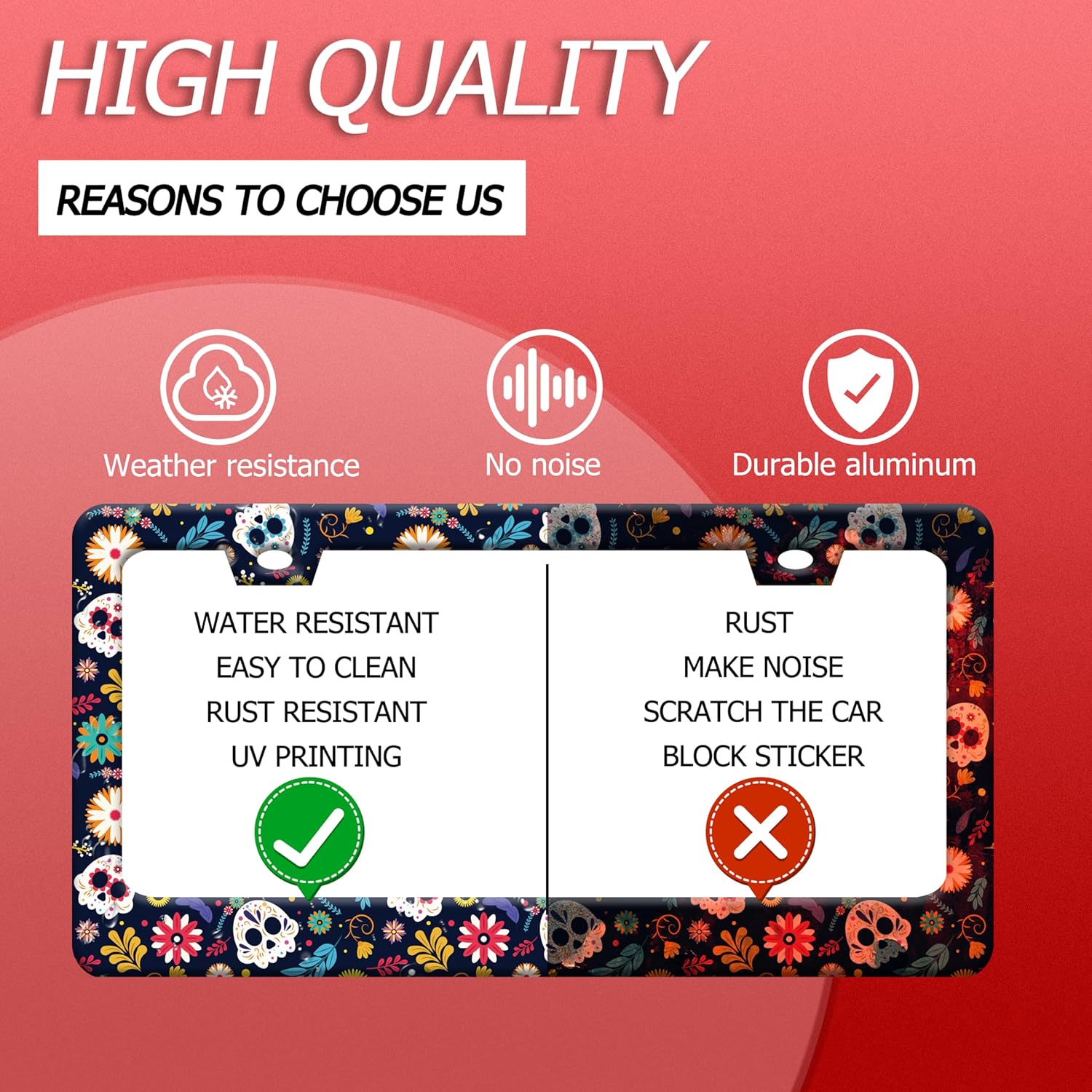 Sugar Skull Flowers License Plate Frame Cute Colorful License Plate Frames Stainless Steel Accessories Cars Decor with 2 Holes and Screws Fits Standard US CA Vehicles Size 12.2 x 6 Inches