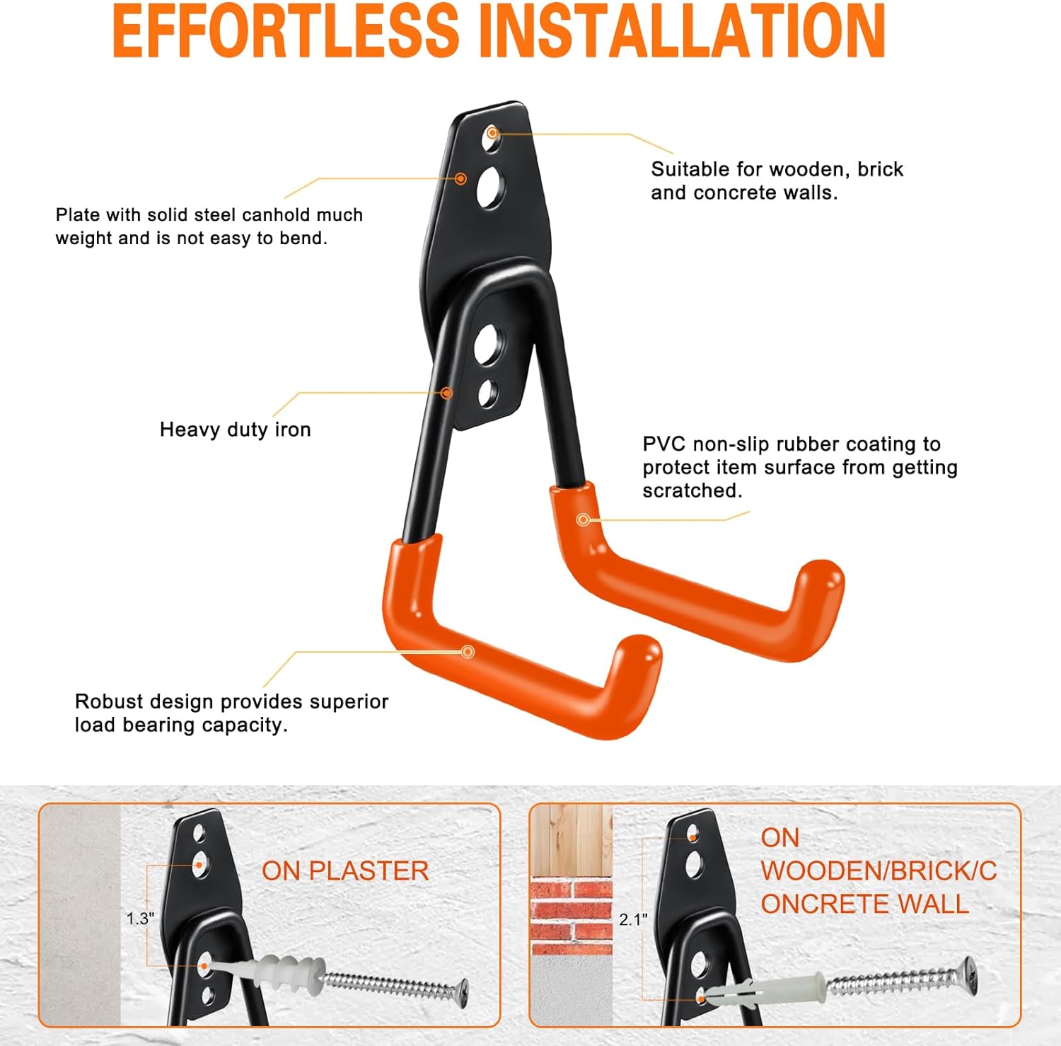 - Heavy-Duty Hooks: Six 2.8 inch U shaped wall mounted garage hooks, The tubular double bar hooks design makes the garage utility storage hooks more stable than regular single tong hooks.