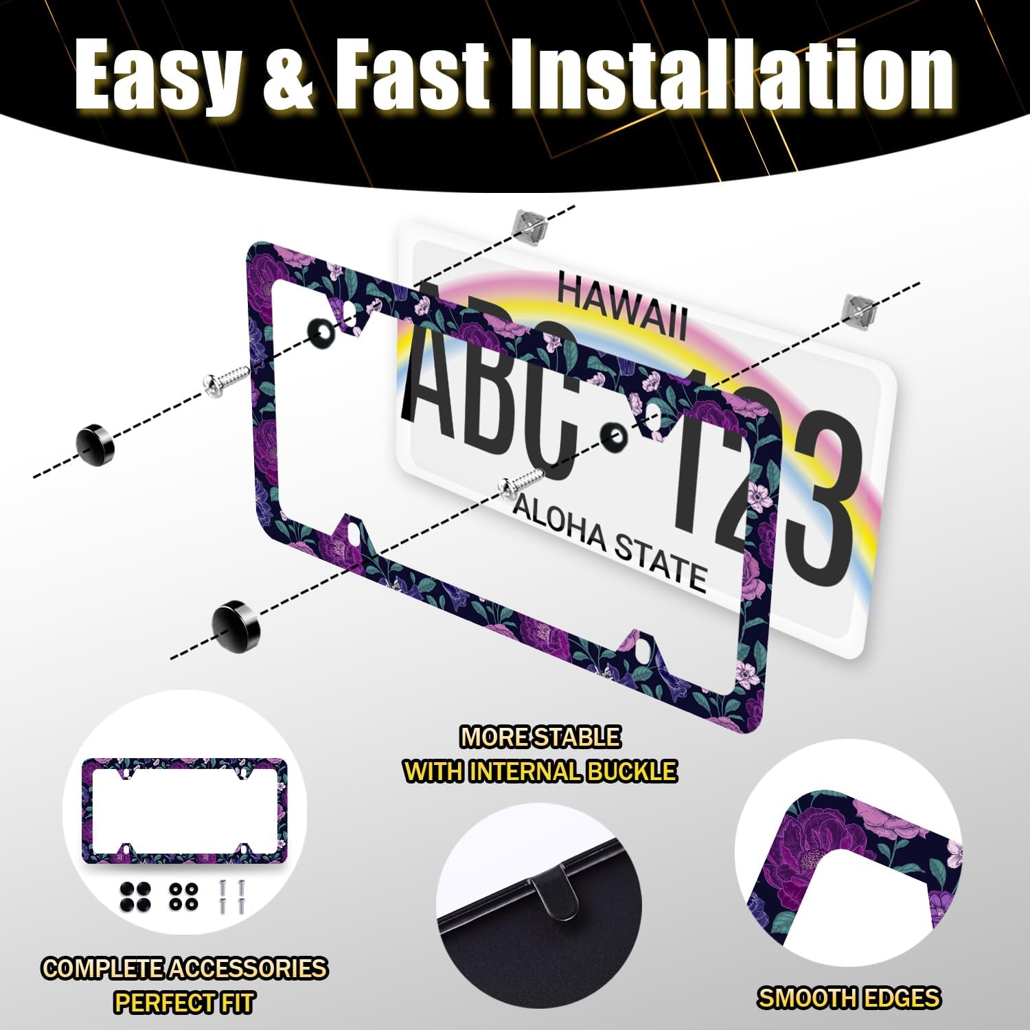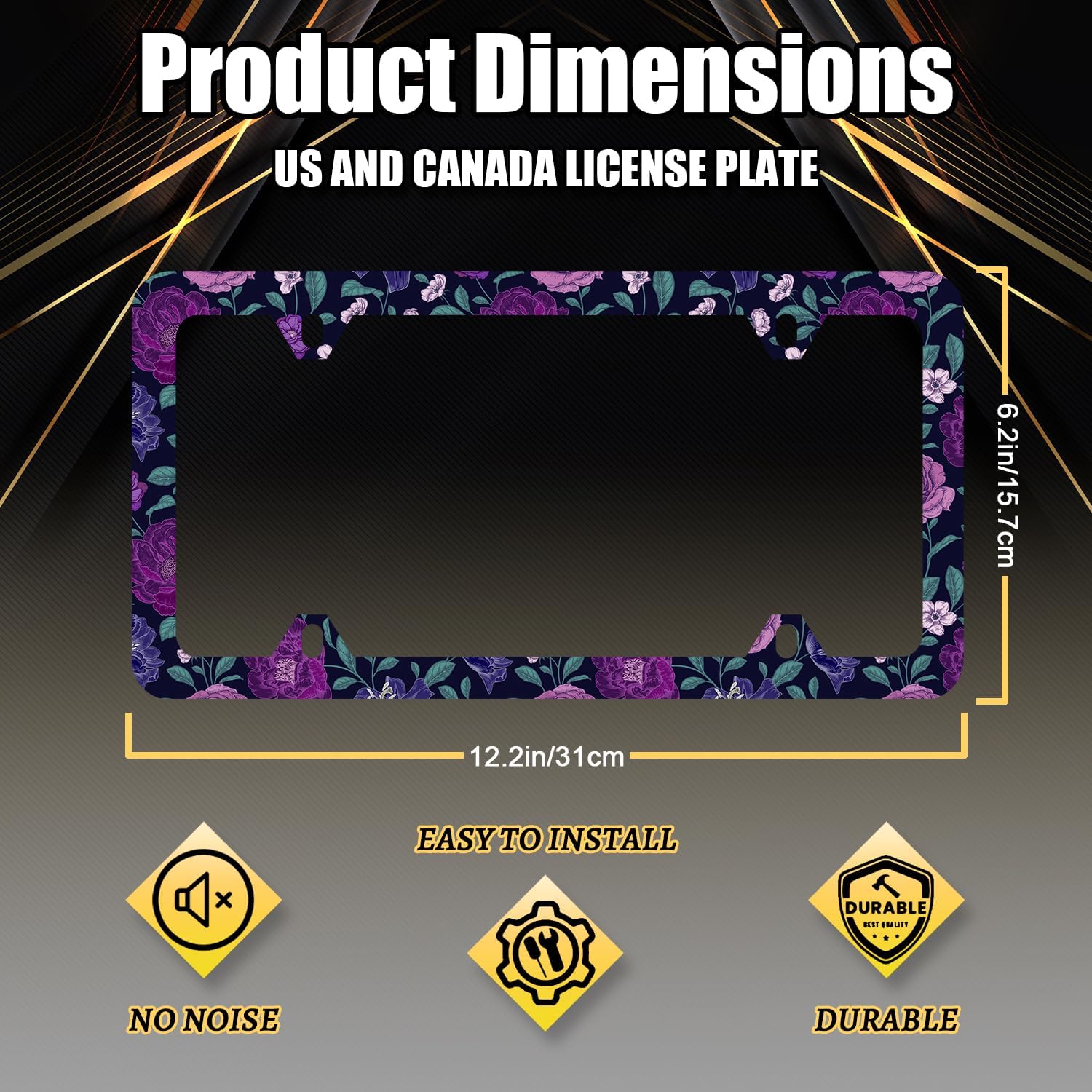 Purple Floral Flowers License Plate Frame Roses Peonies Colorful License Plate Stainless Steel Flowers Car Accessory Funny License Plate Decoration Women Size 12.2" x 6.2" with Screws