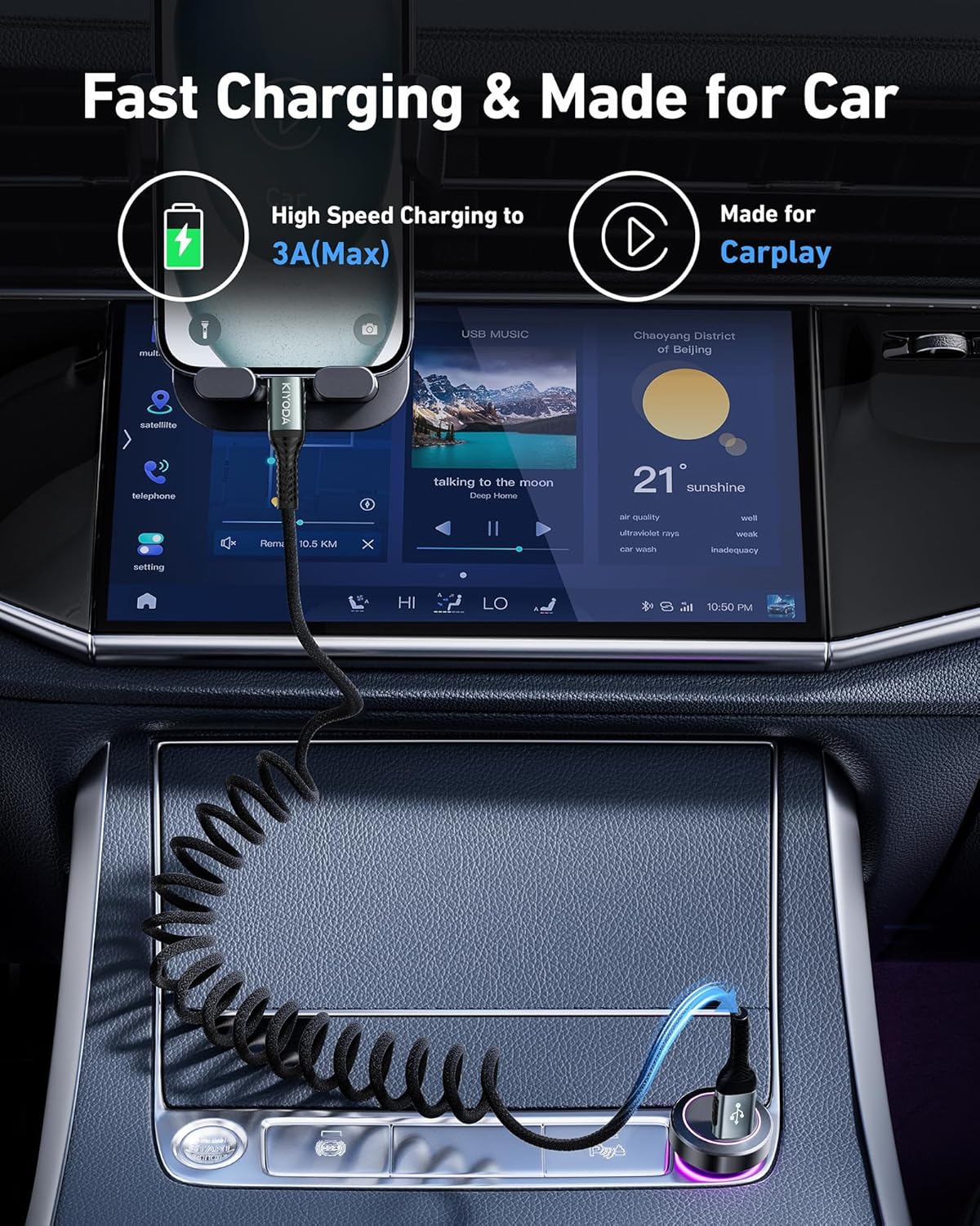 - Coiled USB C Cable: This coil cable is designed with retractable spring design, no tangle, no knot, not taking up space and easy to carry and use. The automatic rebound design for car charging saves space on the center console and avoids clutter. It is perfectly compatible with Apple's CarPlay and Android Auto, with fast charging and data synchronization.