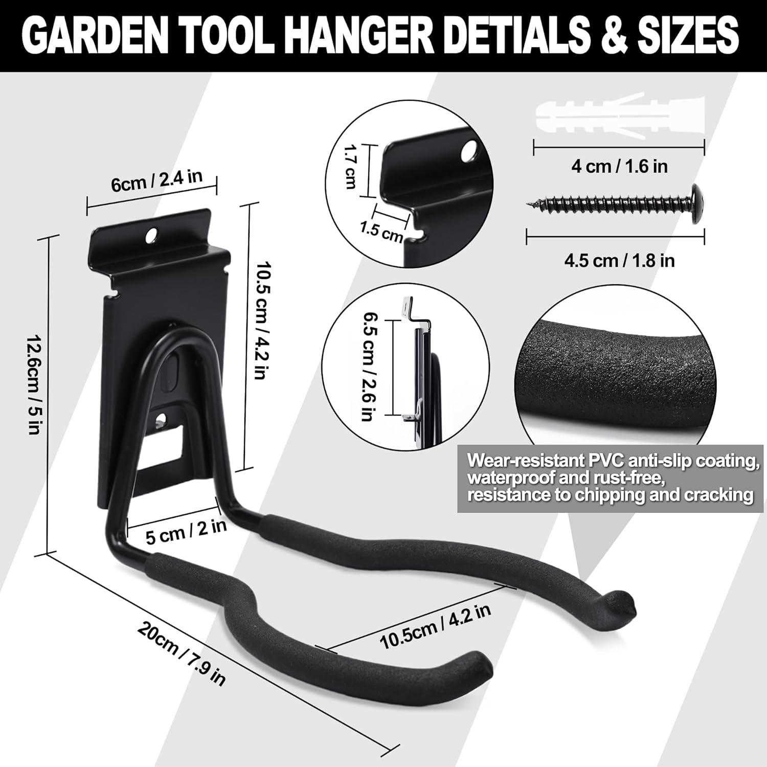 • 【MULTIPURPOSE GARAGE TOOL HANGER】Mount it in your garden, yard, shed or garage as you wish. Perfect for hanging power tools especially like string trimmers, weedeaters, power drills, gas edgers, chainsaws, blowers and lawnmowers, or garden tools like shovels, ladders, mops, brooms, hoses, snow shove or any hangable items.
