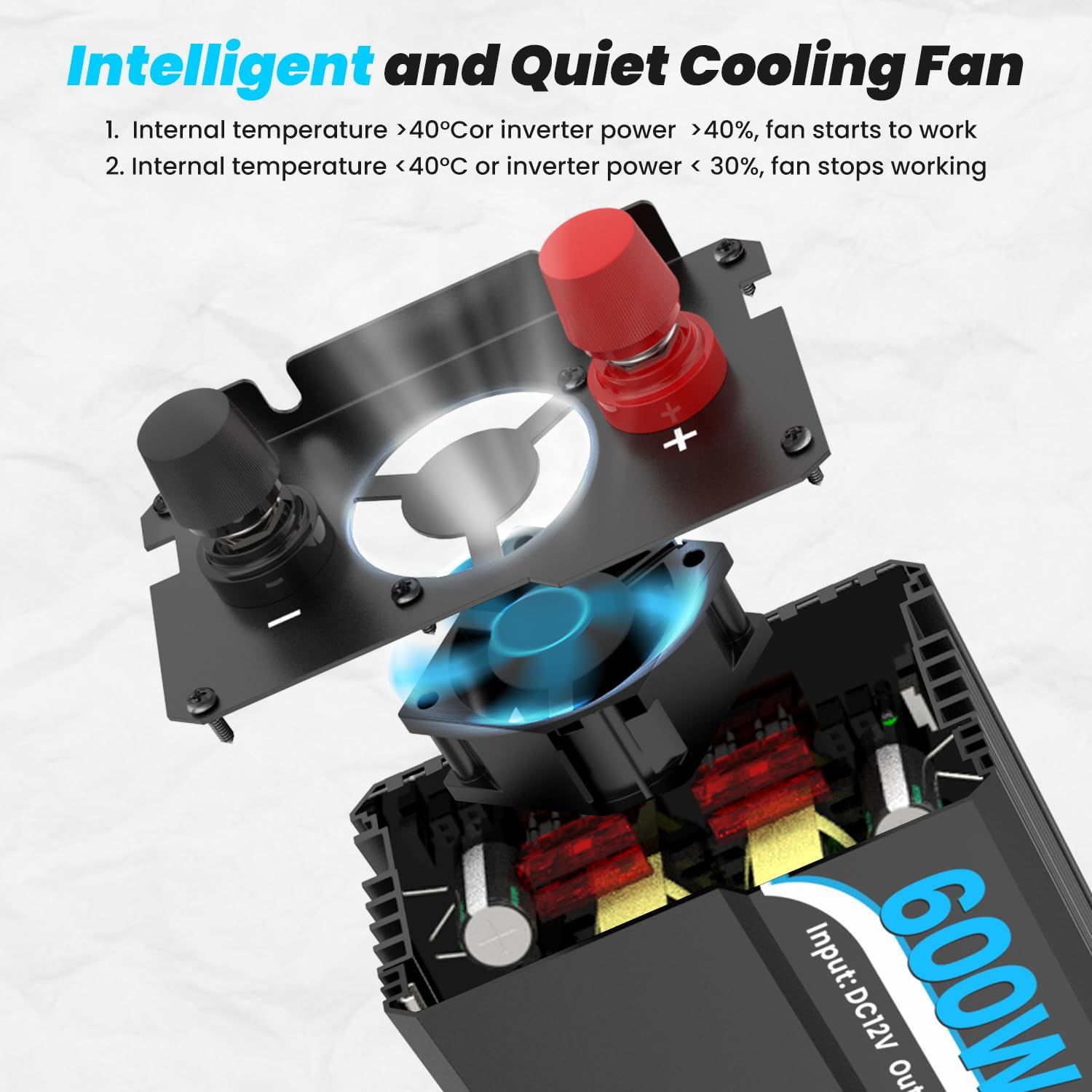- 【WELL-BUILT 600W PURE SINE WAVE INVERTER/ 1200W PEAK POWER】- Advanced pure sine wave technology, convert the stable quality current to your electronics and home appliances. Run equipment just as smoothly, no strange buzzing sounds and no when your electronics are turned on.