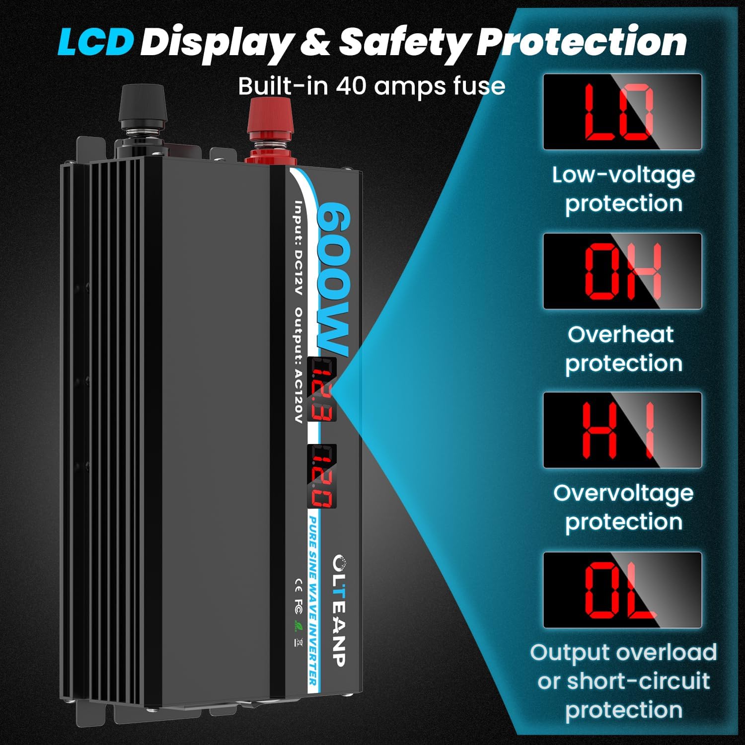 - 【LCD DISPLAY MASTER THE INVERTER WORKING STATUS】- You can get troubleshooting from the LCD display to adjust the inverter and your battery. It will show the LO(low voltage protection), OH(over heat protection), HI(over voltage protection), OL(output overload or short-circuit protection). Control the inverter status easily.