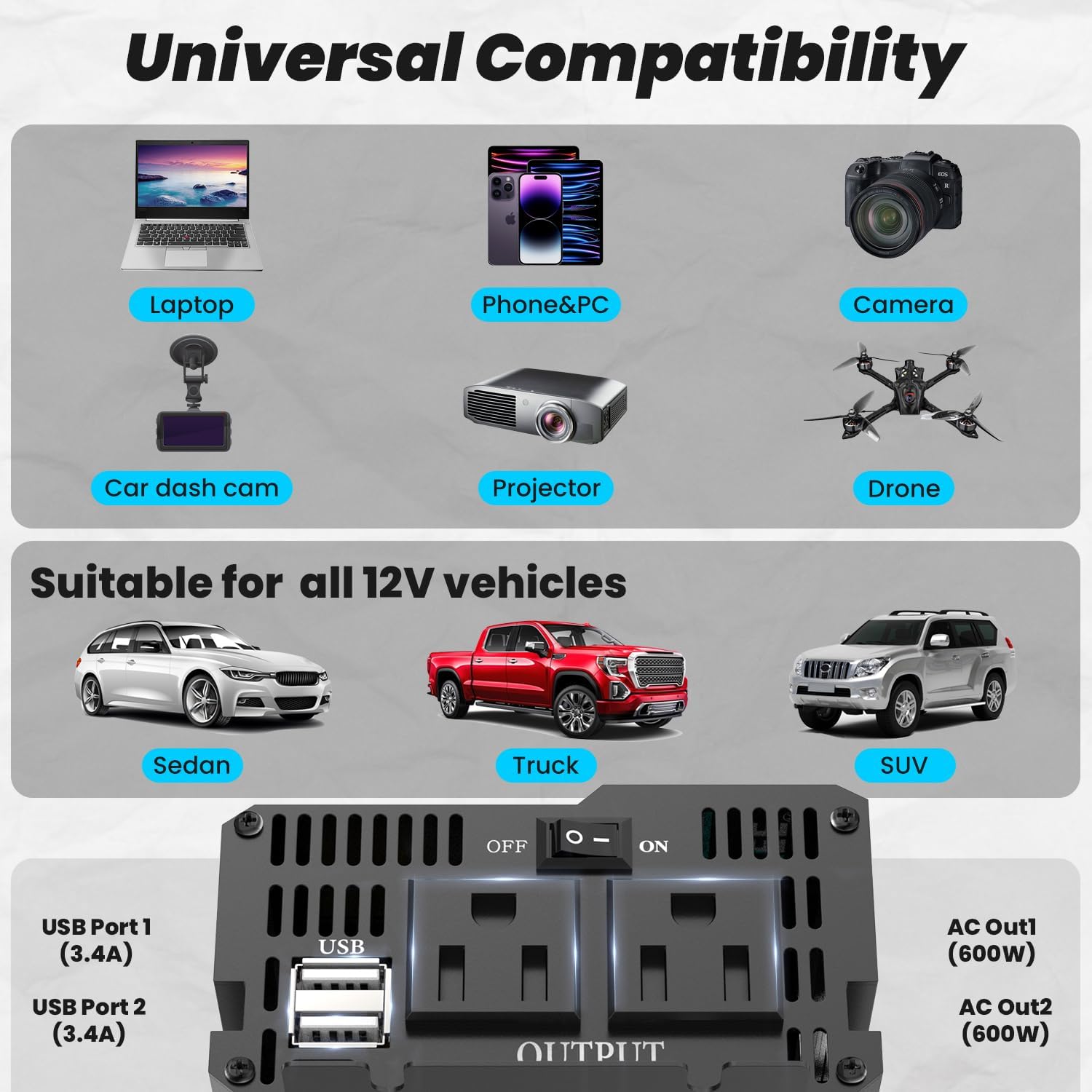 - 【POWERFUL 12V DC-110/120V AC CAR POWER INVERTER】- With professional and advanced technology 600 watts pure sine wave power inverter, you'll be able to charge and power your smartphones, laptops, entertainment devices, small-sized appliances, and other mobile devices.