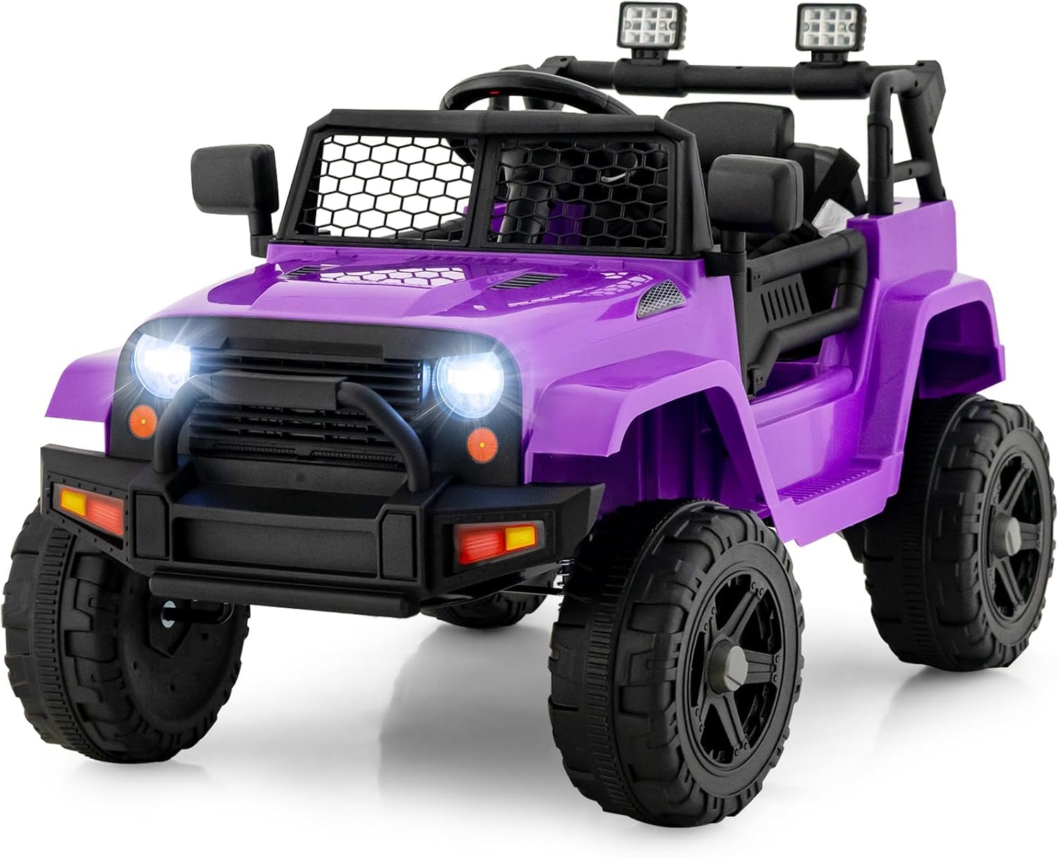 OLAKIDS Kids Ride On Truck, 12V Electric Vehicle Jeep Car with Remote Control, Toddlers Battery Powered Toy with 2 Speeds, Spring Suspension, Double Open Doors, LED Light, Music, TF, USB, Mp3 (Purple)