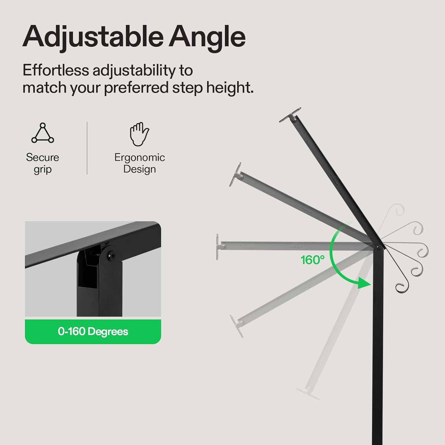 - Adjustable & Flexible: This stair railing offers effortless adjustability to match your preferred step height; Angle adjustment spans from 0 to 160 degrees, accommodating various height requirements; Not only suitable for 1 to 4 vertical steps, but also suitable for use on horizontal surfaces