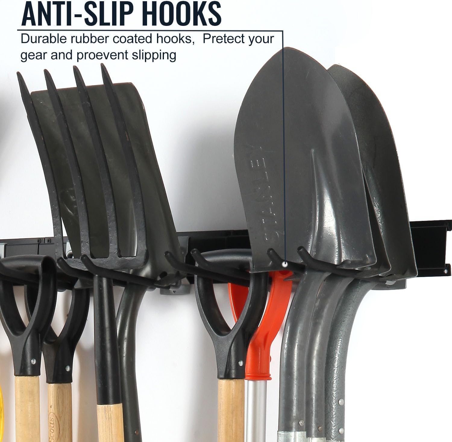 - PROTECTIVE ANTI-SLIP HOOKS: Rubber-coated garage wall hooks provide an anti-slip grip, protecting tools from scratches and falls, enhancing overall safety. These tool hooks for garage walls are designed to keep your tools secure and in place.