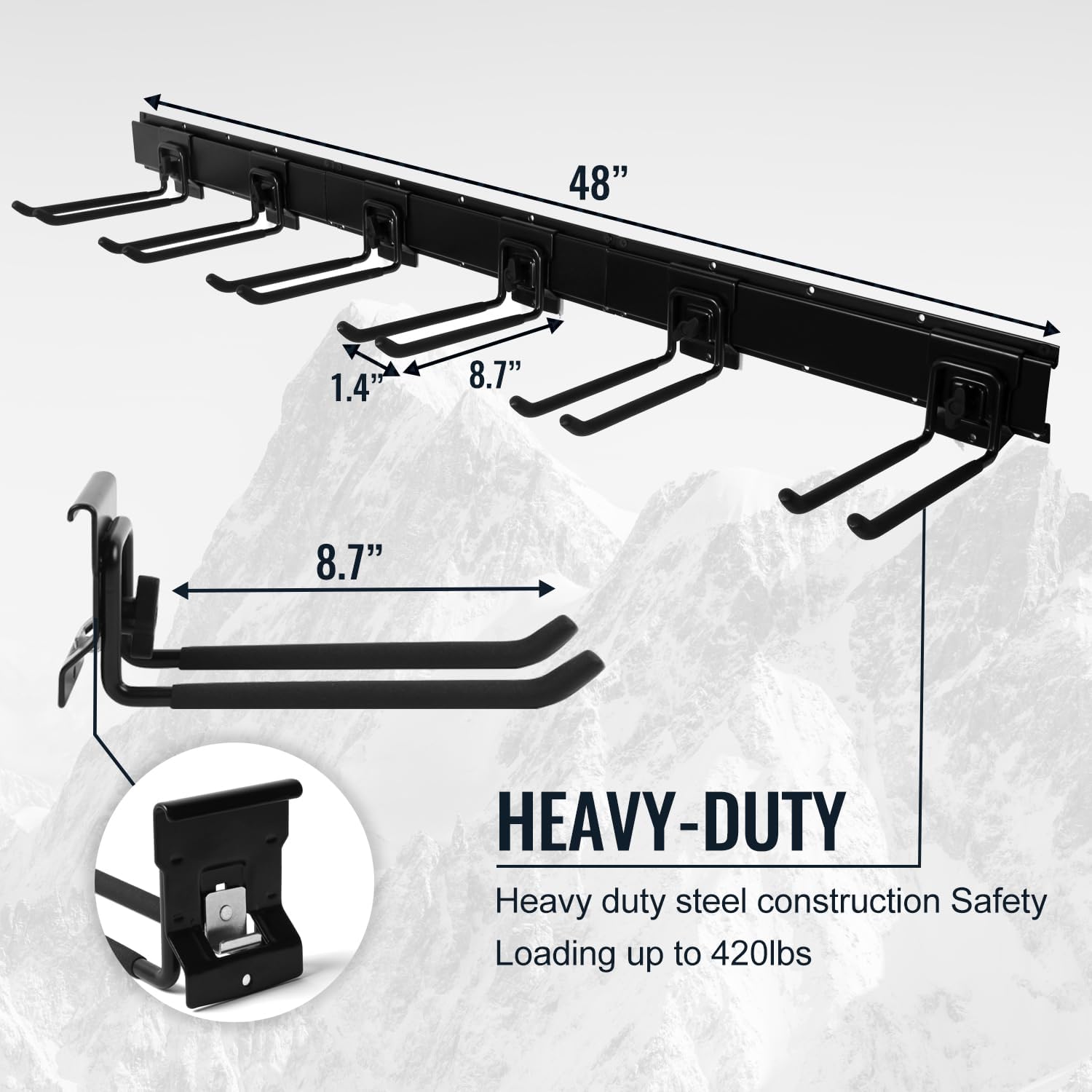 - HEAVY DUTY STEEL CONSTRUCTION: Crafted from industrial-grade steel, our garage tool hanger is incredibly durable, supporting up to 420 pounds—perfect for heavy garden tools. These heavy-duty garage hooks are designed to last and handle your toughest tools.